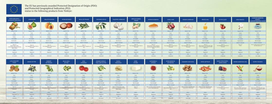 The EU has awarded PDO or PGI (Protected Geographical Indication) status to the following products from Türkiye: Antep Baklavası/Gaziantep Baklavası, Aydın Kestanesi, Aydın İnciri, Bayramiç Beyazı, Malatya Kayısısı, Milas Zeytinyağı, Taşköprü Sarımsağı, Giresun Tombul Fındığı, Antakya Künefesi, Suruç Narı, Çağlayancerit Cevizi, Gemlik Zeytini, Edremit Zeytinyağı, Milas Yağlı Zeytini, Ayaş Domatesi, Edremit Körfezi Yeşil Çizik Zeytini, Maraş Tarhanası, Ezine Peyniri, Safranbolu Safranı, Aydın Memecik Zeytinyağı, Araban Sarımsağı, Bingöl Balı, Osmaniye Yer Fıstığı, Bursa Şeftalisi, Hüyük Çileği, Bursa Siyah İnciri/Bursa Siyahı, Söke Pamuğu, Manisa Mesir Macunu, Gaziantep Menengiç Kahvesi / Gaziantep Melengiç Kahvesi, and Silifke Yoğurdu.