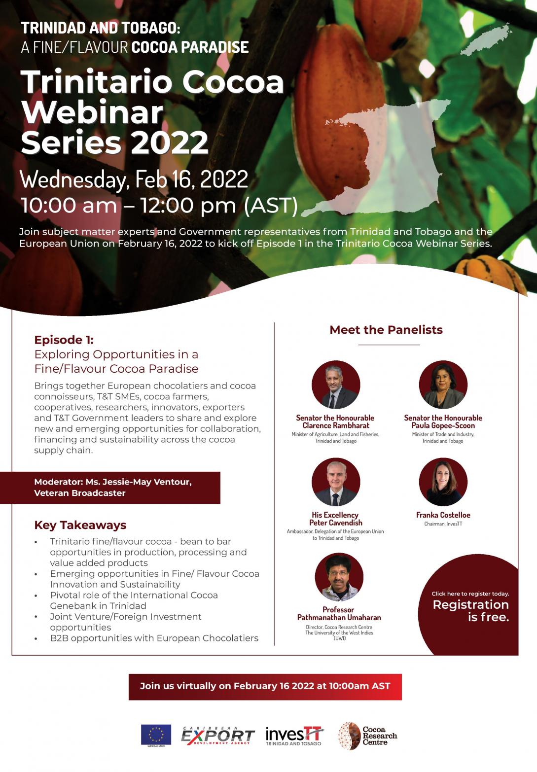 This unique webinar series will see for the first time the coming together of stakeholders in Trinidad and Tobago with some of the largest business organizations in Europe (for chocolatiers, cocoa connoisseurs and investors) to explore new and emerging opportunities for collaboration, financing and sustainability across the cocoa supply chain.