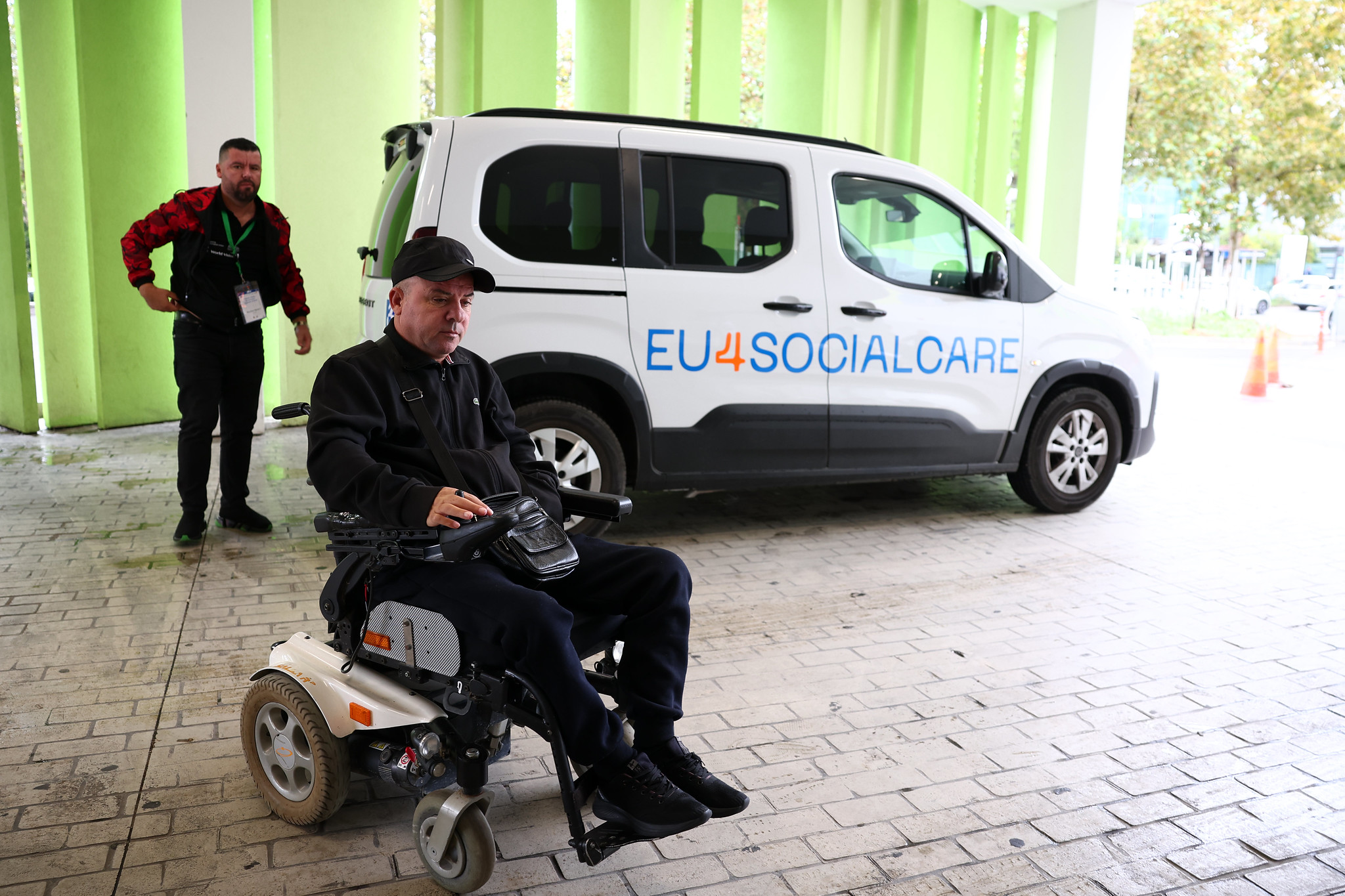 On a rainy day, Ilir Rusi makes his way uphill through one of the rural areas of Paskuqan in his electric wheelchair. The EU4SocialCare car will accompany him to the ‘Mother Teresa’ University Hospital Centre, where he receives physiotherapy.