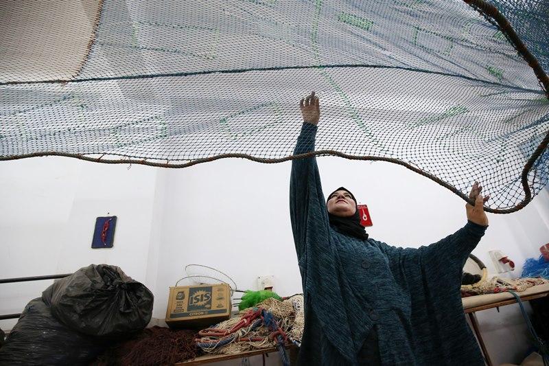Karima Daïkhi est fière de ses mains rugueuses. Cette mère de famille de 53 ans passe la grosse aiguille plate entre les mailles du filet, fait un nœud et coupe le fil d’un coup sec. Sourire aux lèvres, elle reproduit machinalement ce geste sous le regard de Bouchra Salah, enseignante à l’Ecole de formation technique de la pêche et de l'aquaculture de Cherchell.