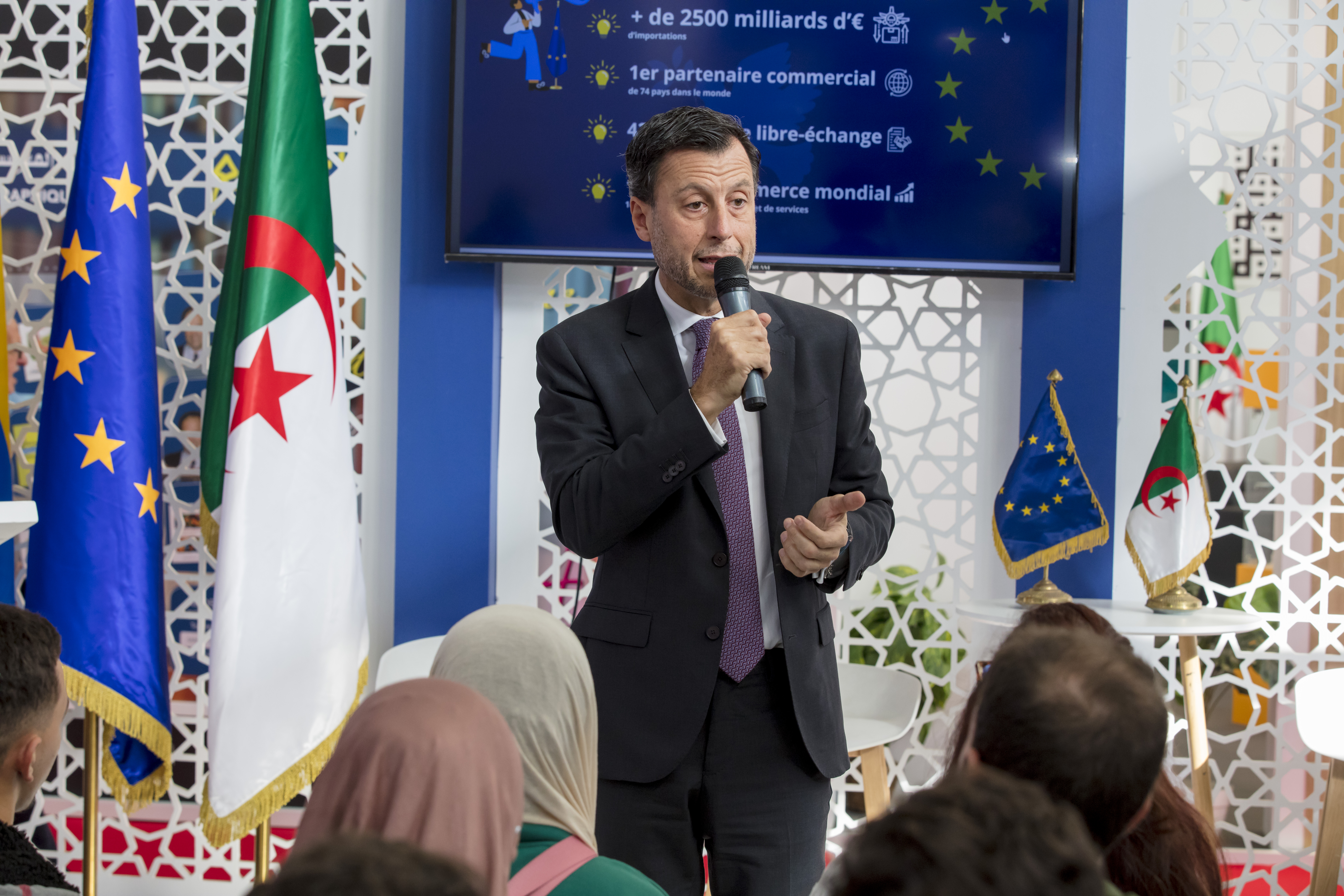 A l’entame des activités sur le stand de l'UE, l’Ambassadeur de l’UE en Algérie, M. Diego Mellado, a fait une présentation sur les missions et le rôle de l’Union européenne en Algérie, et répondu aux questions du public venu nombreux.