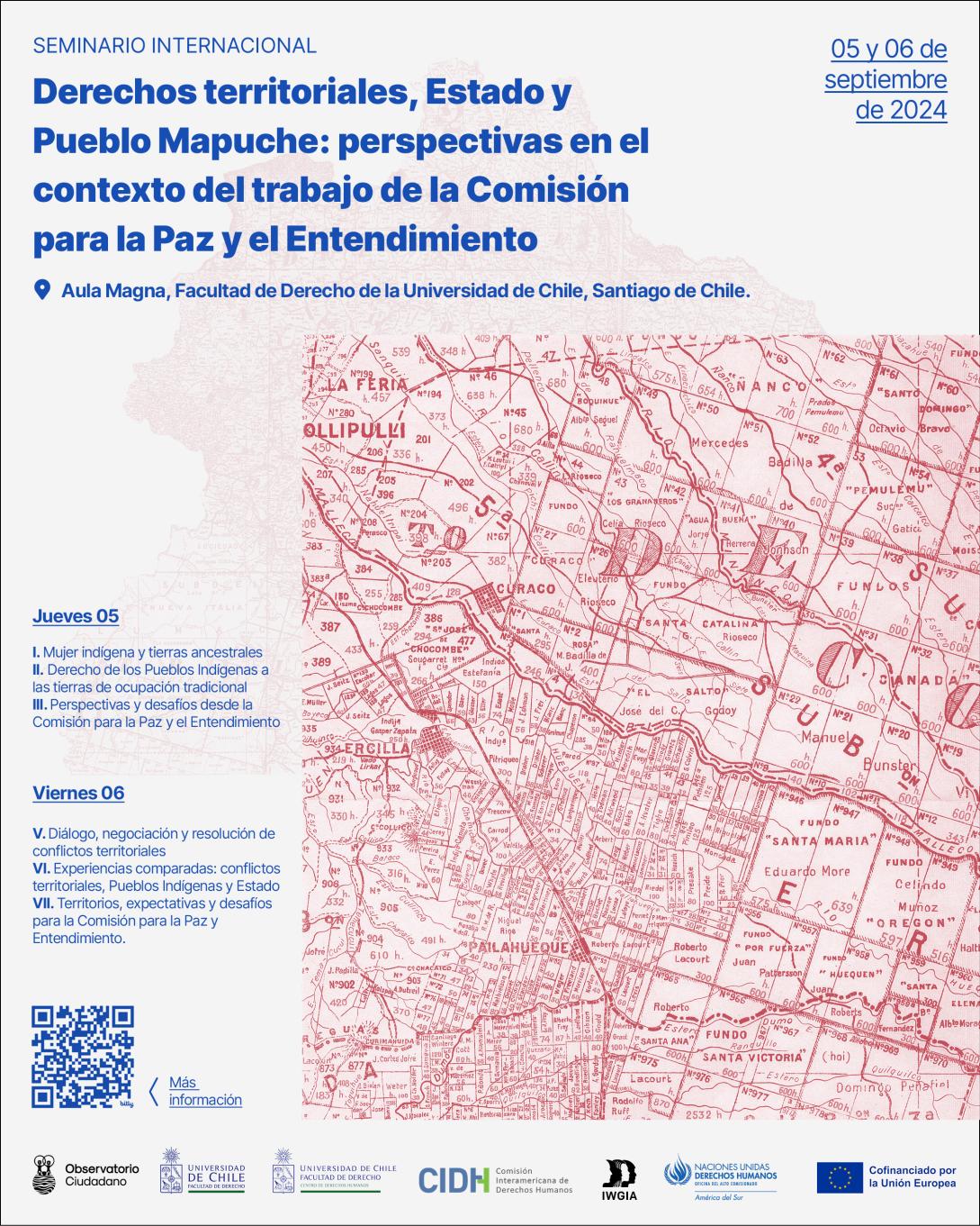 El evento, abierto a público, se realizará en Santiago de Chile, los días 5 y 6 de septiembre de 2024 en la Facultad de Derecho de la Universidad de Chile, coorganizado por la Unión Europea (UE), el Observatorio Ciudadano (OC), la Comisión Interamericana de Derechos Humanos (CIDH), la Oficina del Alto Comisionado de las Naciones Unidas para los Derechos Humanos, el Centro de Derechos Humanos de la Facultad de Derecho de la Universidad de Chile y el International Work Group for Indigenous Affairs (IWGIA).