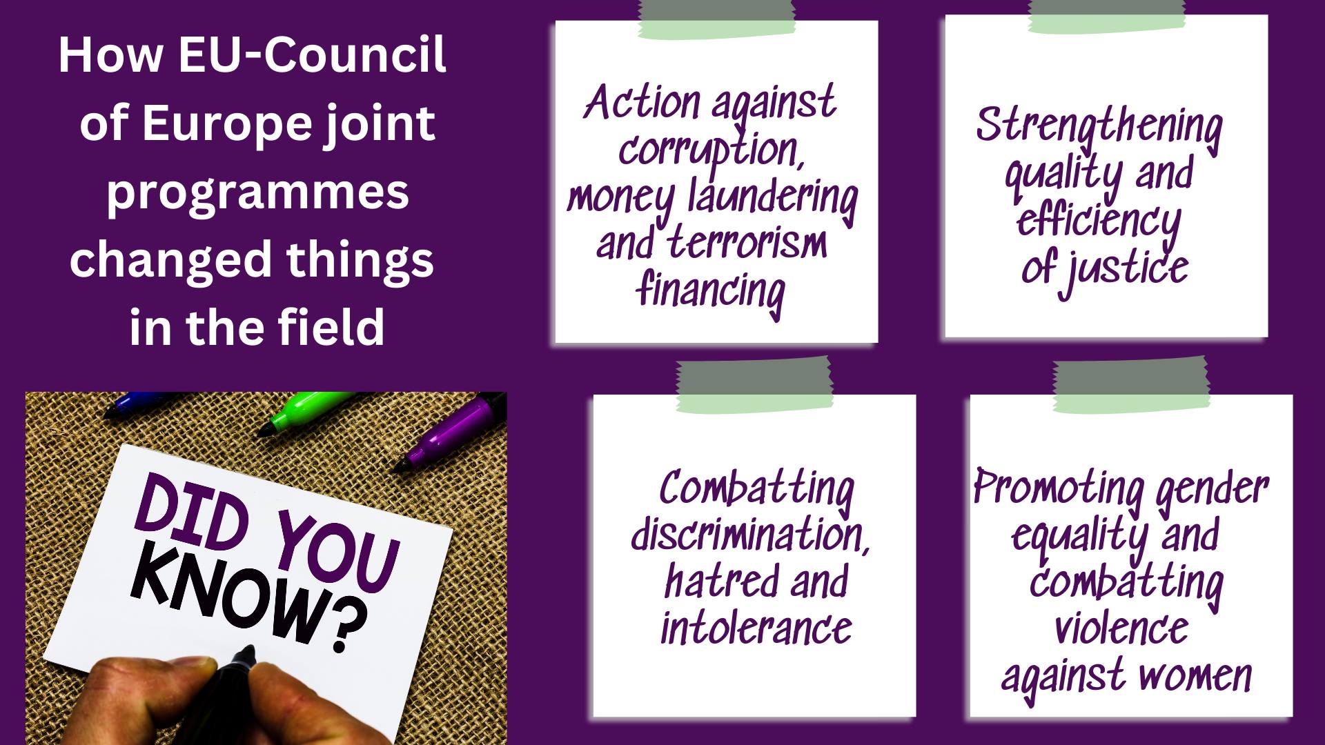 In the context of the EU enlargement package 2023, this social media campaign aims to raise awareness of the role of the EU and the Council of Europe's joint programmes in the EU enlargement progress. The EU and the Council of Europe accompany EU candidate countries towards meeting the membership criteria. The Horizontal Facility and the Partnership for Good Governance programmes support domestic reforms to comply with European standards, a priority for the EU enlargement process. The slides illustrate achievements to strengthen justice, counter economic crime, promote equality and non-discrimination, and combat violence against women.