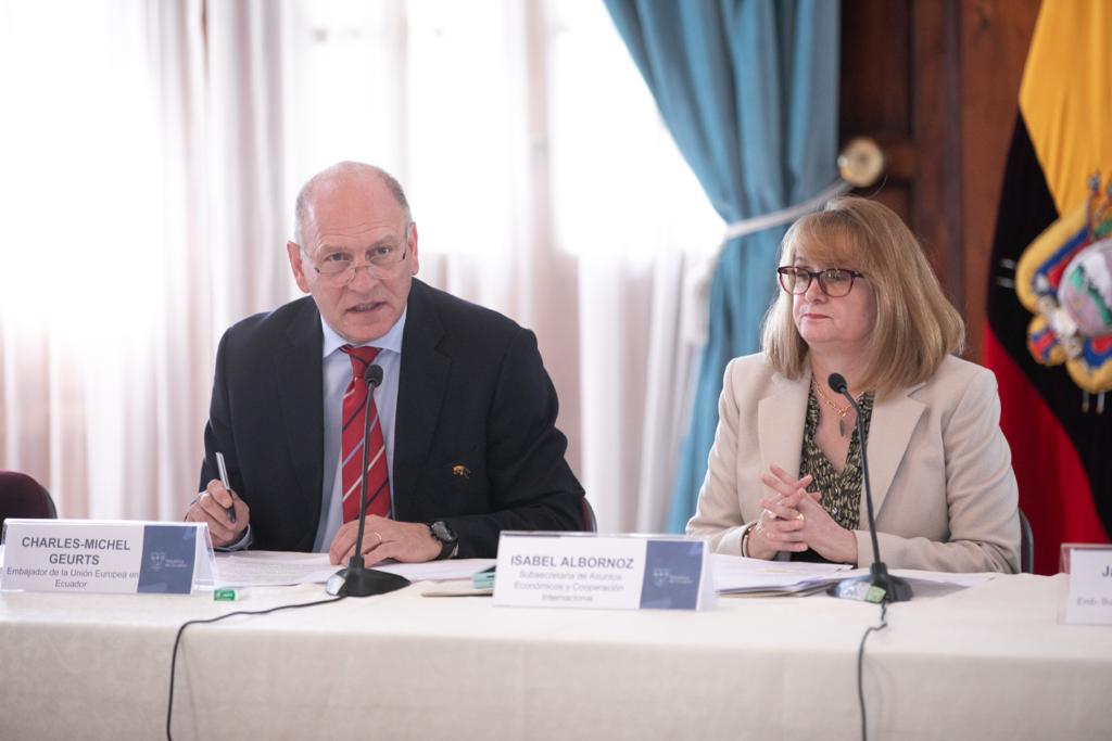 La III Mesa fue copresidida por la Subsecretaria de Asuntos Económicos y Cooperación Internacional de la Cancillería, Isabel Albornoz, y por el Embajador de la Unión Europea en Ecuador, Charles-Michel Geurts.