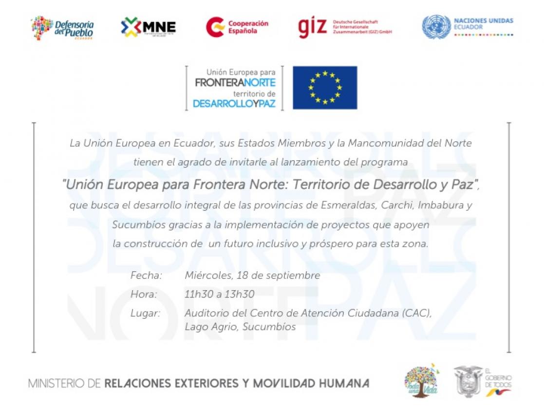La iniciativa “Unión Europea para Frontera Norte: Territorio de Desarrollo y Paz" se enfoca en las provincias de Esmeraldas, Carchi, Imbabura y Sucumbíos y engloba diversas iniciativas. Una de ellas es establecer el Sistema de Alerta y Respuesta Temprana (SART) de la Defensoría del Pueblo para salvaguardar los Derechos Humanos de la población más vulnerable, que será implementada por el Sistema de Naciones Unidas (liderado por ACNUR).