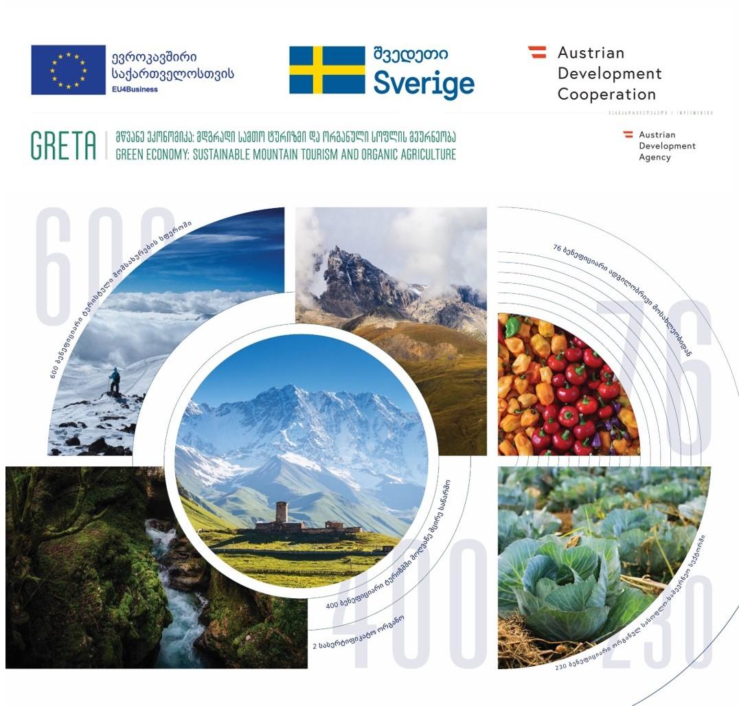 განაცხადების შემოტანის ბოლო ვადაა 25 მაისი 2020 წ. (16:00 თბილისის დროით). განიხილება მხოლოდ ქართულ ენაზე, სრულად შევსებული განაცხადის ფორმა, რომელიც მიღებული იქნება greta@ada.gv.at  ინფორმაცია პროექტ GRETA-ს შესახებGRETA წარმოადგენს მთის ტურიზმისა და ორგანული სოფლის მეურნეობის განვითარების მხარდაჭერის ოთხწლიან პროექტს, რომლის მიზანია განავითაროს ხსენებულ სექტორებში მცირე და საშუალო საწარმოები. პროექტი აგრეთვე ხელს შეუწყობს სათანადო ბიზნეს გარემოსა და შემოსავლების გენერირების შესაძლებლობათა განვითარებას. პროექტი მოიცავს საქართველოს სამ რეგიონს ზემო სვანეთს, რაჭასა და ზემო იმერეთს; მისი მთლიანი ღირებულება 6,8 მილიონი ევროა და იგი დაფინანსებულია ევროკავშირისა და ევროკავშირის ორი წევრი ქვეყნის - ავსტრიისა და შვედეთის მთავრობების მიერ. დეტალური ინფორმაცია შეგიძლიათ იხილოთ აქ. დეტალური ინფორმაციისთვის გთხოვთ მიმართოთ: