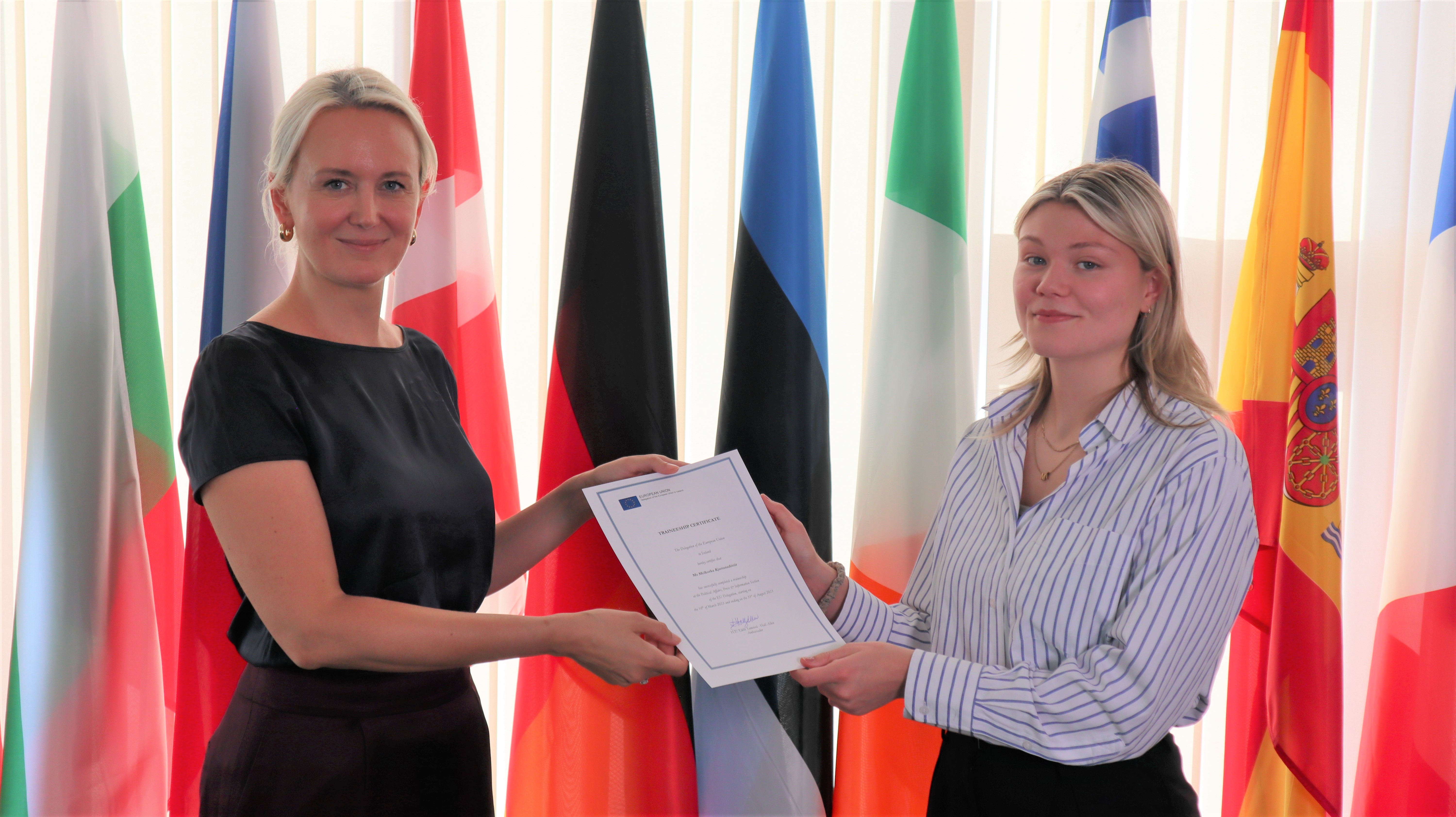 Breadcrumb EEAS Iceland Farewell to our trainee, Melkorka PRINT Farewell to our trainee, Melkorka 25.08.2023 Press and information team of the Delegation to ICELAND Today was Melkorka Kjaransdóttir last working day as a trainee at the political, press and information section for the past 5 months. Melkorka has been a valuable member of the team and we wish her all the best. MORE STORIES STORY The Delegation participates in the Reykjavik Book Fair! STORY Mr Kristján Sævald Pétursson Joins the EU Delegation STORY Opening of the European Award Season at Bíó Paradís STORY Farewell to our Policy, Press and Information Officer Viktor Stefánsson STORY Political Science Students from University of Iceland Attended a "Science Trip" See more