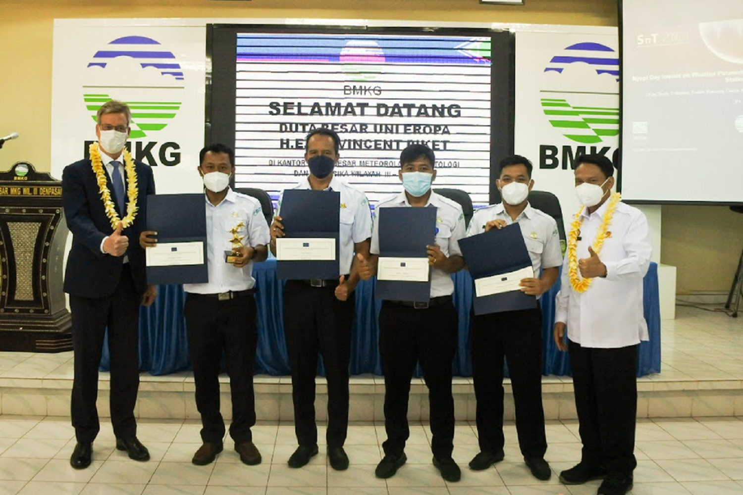 Duta Besar Uni Eropa untuk Indonesia, Bapak Vincent Piket, menyerahkan penghargaan European Union (EU) Star Award kepada empat peneliti Badan Meteorologi Klimatologi dan Geofisika (BMKG) Denpasar, Bali, atas penelitiannya yang berkontribusi terhadap pemantauan iklim dan studi kualitas udara.