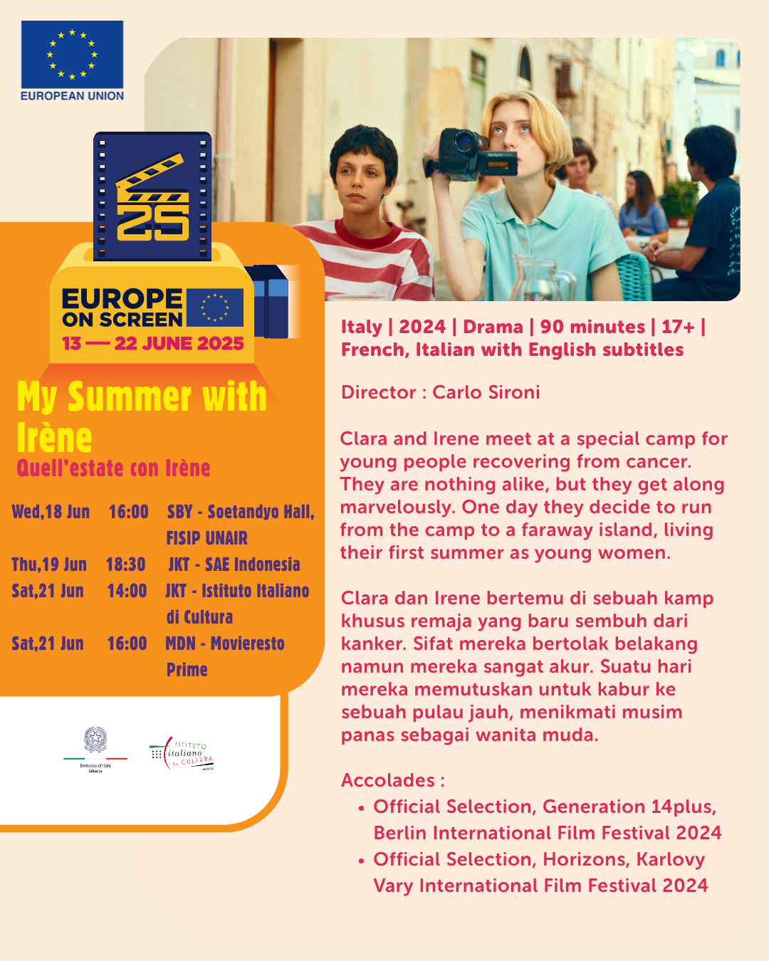 Breadcrumb EEAS Indonesia My Summer with Irene (Italy) PRINT My Summer with Irene (Italy) 02.06.2025 Press and information team of the Delegation to INDONESIA and BRUNEI DARUSSALAM © EU PRACTICAL INFORMATION OVERVIEW 18.06.2025