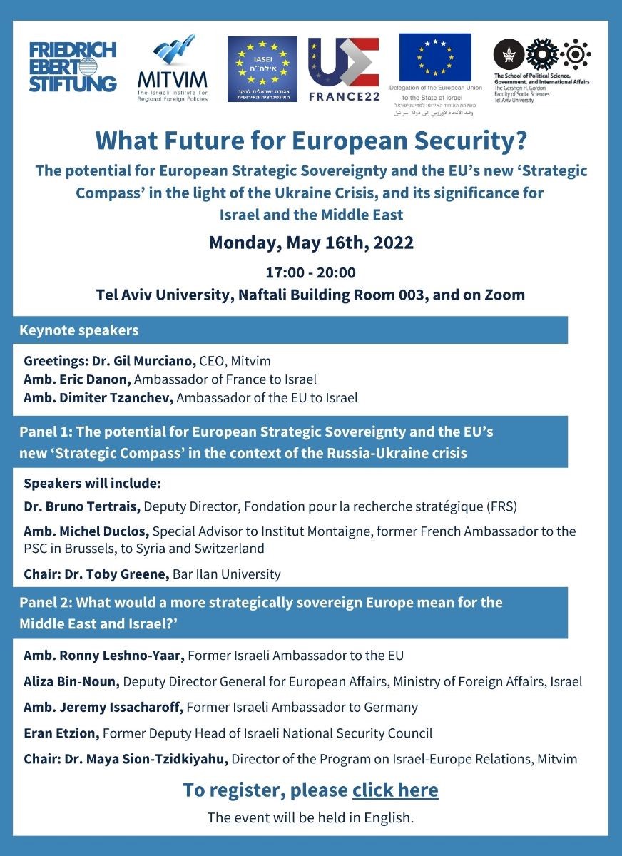 The IASEI, the French Embassy, the EU Delegation to Israel and the Mitvim Institute invite you to register for the following event: 'What future for European security? The potential for European Strategic Sovereignty and the EU’s new ‘Strategic Compass’ in the light of the Ukraine Crisis, and its significance for Israel and the Middle East.'