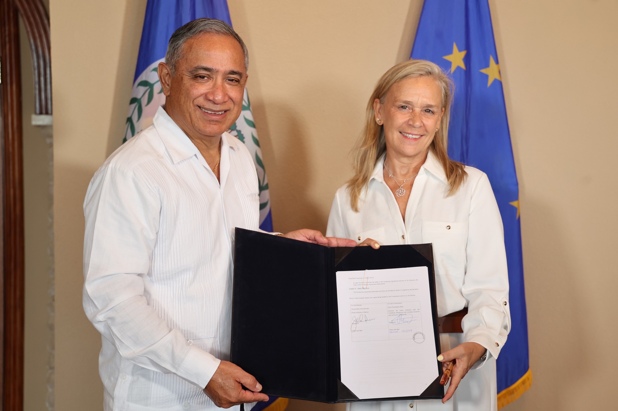 Prime Minister Hon. John Briceño and H.E. Marianne van Steen, Ambassador of the European Union (EU) to Belize, have reaffirmed the long-standing partnership between the Government of Belize and the EU with the signature of the Financing Agreement of EUR 12.6 million (around USD 13.5 million). The funds are part of the current EU commitment of EUR 17 million with opportunities to be increased in the next years. The EU funds support the Government of Belize in achieving the targets of the #planBelize Medium-Term Development Strategy.
