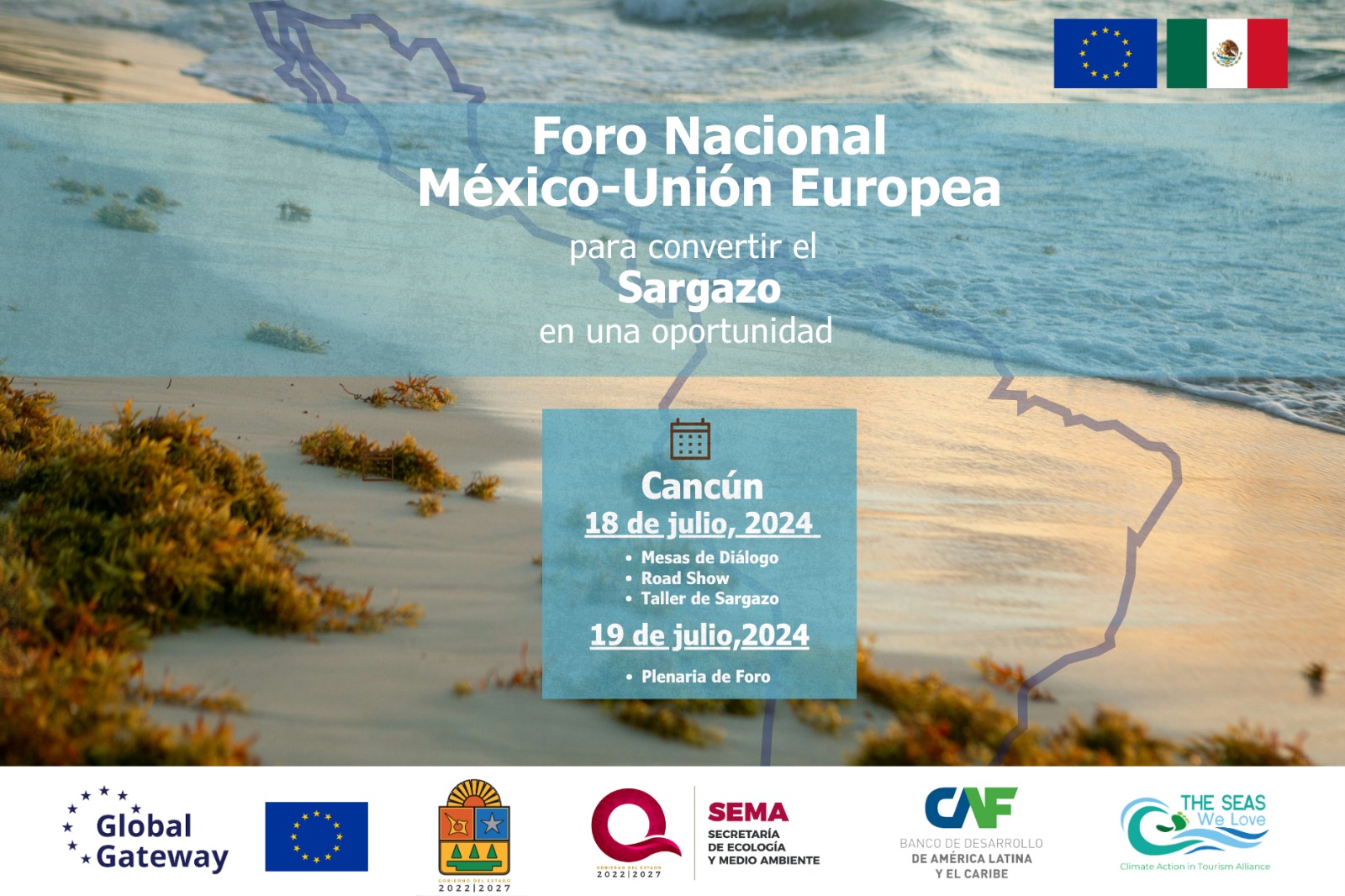 La Unión Europea (UE), la Secretaría de Ecología y Medio Ambiente del Estado de Quintana Roo, CAF -banco de desarrollo de América Latina y el Caribe- y The Seas We Love coorganizan el “Foro Nacional México-Unión Europea 2024 para convertir el sargazo en una oportunidad”, que se llevará a cabo los días 18 y 19 de julio en Cancún, Quintana Roo, con el objetivo de generar propuestas y acciones concretas para avanzar en las mejores soluciones para mitigar el arribo del sargazo en el Caribe Mexicano.