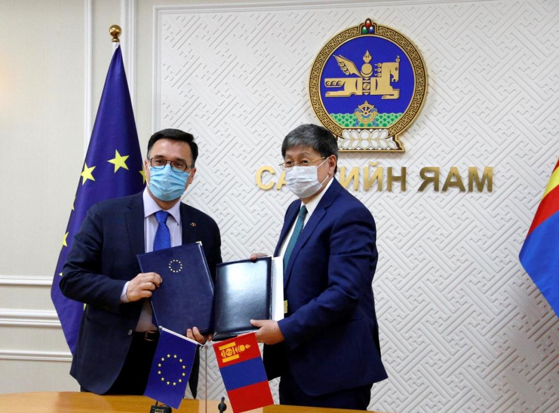 Европын Холбоо анх удаа Монгол Улсын төсөвт дэмжлэг үзүүлж 50,8 сая евро буюу 155.7 тэрбум төгрөгийн буцалтгүй тусламж олгох Санхүүжилтийн хэлэлцээрт Европын Холбооноос Монгол Улсад суугаа Элчин сайд Траян Христеа, Сангийн сайд Ч.Хүрэлбаатар нар өнөөдөр гарын үсэг зурлаа.