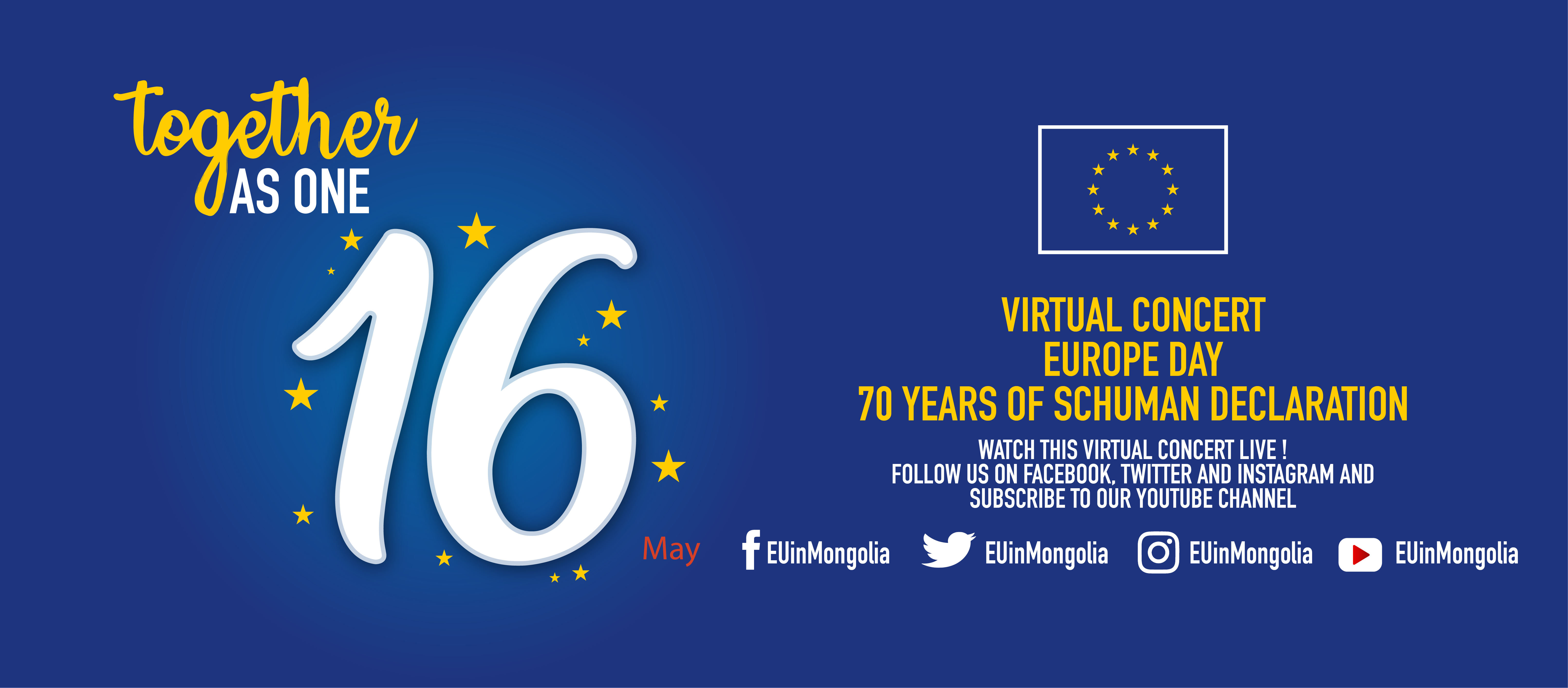 - Virtual Classical Music Concert, which was streamed on the Delegation's YouTube channel YouTube@EUinMongolia (link is external) on 16 May 18:00 with a possibility to watch for entire month The concert will play famous musical pieces from European Union Member States as well as the anthem of the European Union and Mongolia. The concert will be also screened on the Mongolian UBS TV channel.