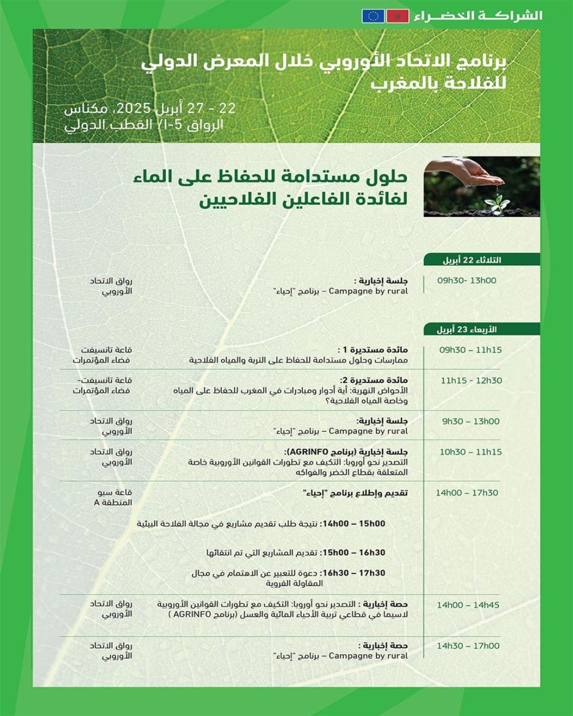 طيلة هذا الأسبوع، سيقترح الاتحاد الأوروبي برنامجاً غنياً موجَّهاً للمهنيين والجمهور العريض والشباب تحت شعار:"هناك حلول مستدامة للحفاظ على الماء خِدمةً للفاعلين الفلاحيين". في هذا السياق، ستُنظَّم محاضرات حول مجموعة من المواضيع منها الحفاظ على الموارد الطبيعية - التربة والأحواض النهرية والفرشات المائية - واستغلال المياه العادمة المعالَجة في الميدان الفلاحي. وفضلا عن ذلك، سيتم تخصيص حصص إخبارية لمرافقة الفاعلين المغاربة في ما يتعلق بالقوانين الأوروبية الجديدة وكذا فرص الولوج إلى السوق الأوروبية.