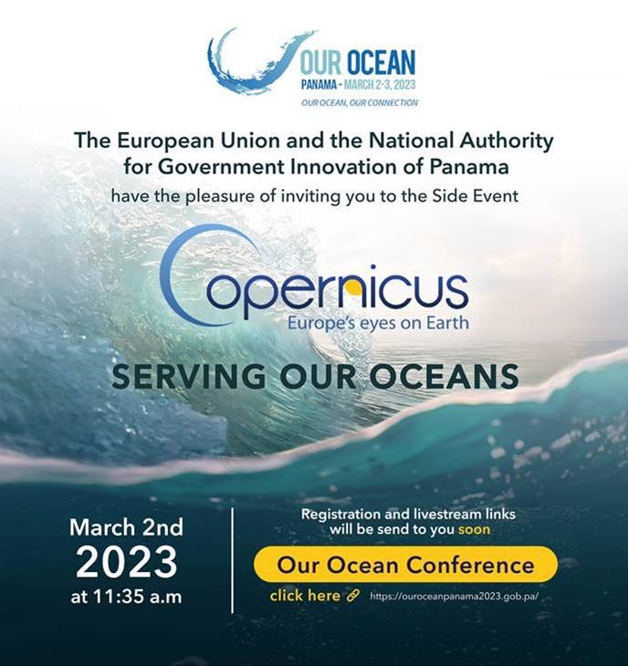 La Unión Europea y la Autoridad Nacional para la Innovación Gubernamental de Panamá (AIG) tienen el placer de invitarte al Side Event "COPERNICUS SERVING OUR OCEANS", sobre la importancia de la observación satelital en la protección de los océanos, en el marco de la Conferencia Nuestro Océano 2023.
