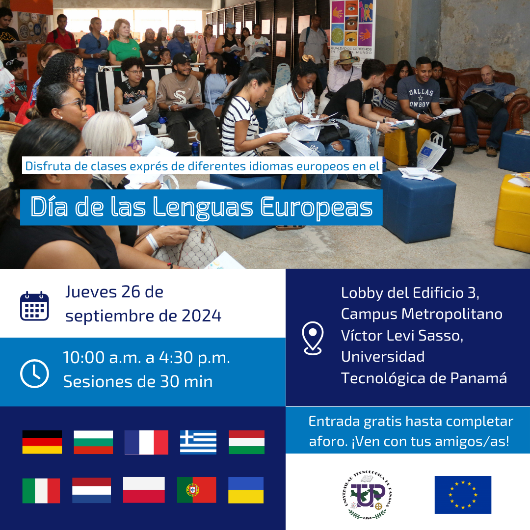 Con ocasión del Día Europeo de las Lenguas, la Delegación de la Unión Europea en Panamá, sus Estados Miembros y la Universidad Tecnológica de Panamá te invitan a una jornada de clases exprés de idiomas europeos.