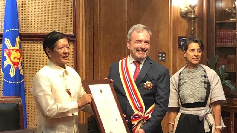 President Ferdinand Marcos Jr confers the Order of Sikatuna to outgoing EU Ambassador to the Philippines, H. E. Luc Véron, for outstanding service in developing and strengthening EU-PH relations.
