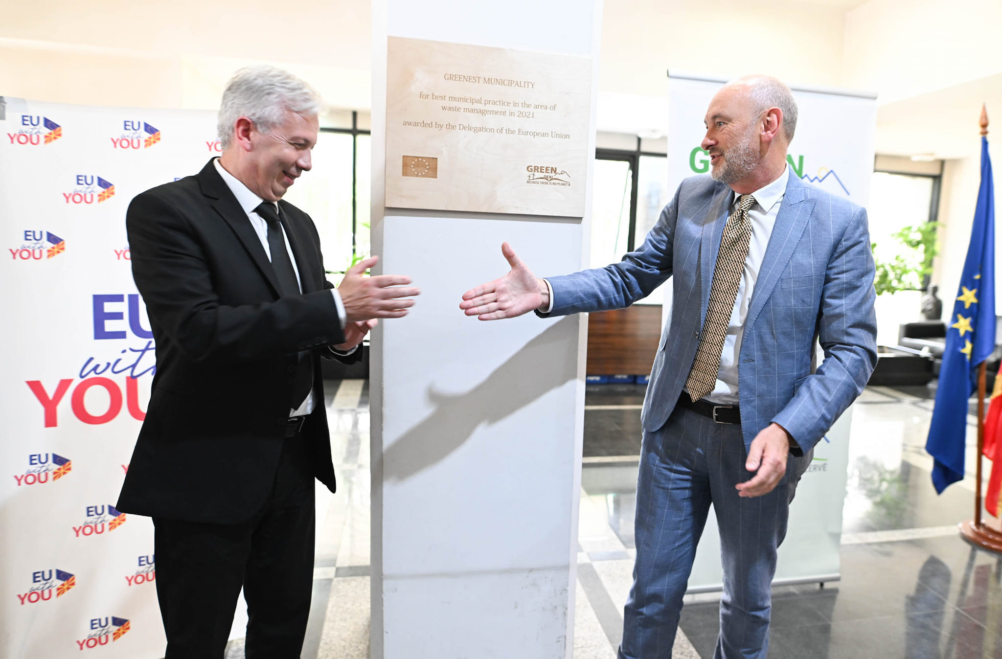BE-ja, si donatori më i madh në Maqedoninë e Veriut, deri më tani ka mbështetur sektorin e menaxhimit të mbeturinave me mbi 50 milionë euro. Kjo përfshin ngritjen e sistemeve të vetëqëndrueshëm dhe të integruar për menaxhimin e mbeturinave në rajonin lindor dhe verilindor të vendit, plotësisht në përputhje me standardet mjedisore të BE-së. Për të ndihmuar në afrimin deri te synimet e Marrëveshjes së Gjelbër, BE-ja do t'u ofrojë komunave gjithashtu grante për efiçencën energjetike të ndërtesave publike – diçka me rëndësi të madhe në këto rrethana.