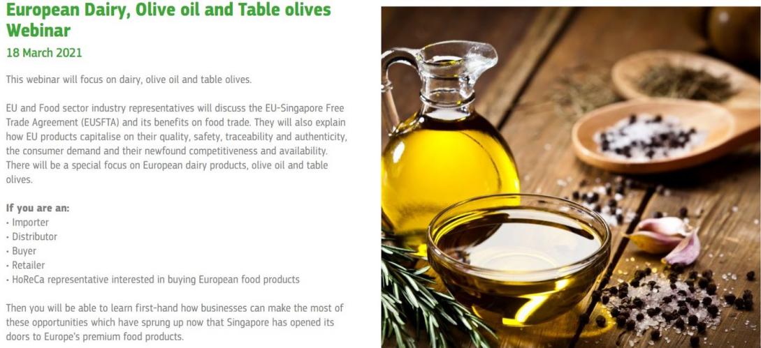 To register for the complimentary European Dairy, Olive Oil and Table Olives Webinar, please click here. Registration closes on 17th March 2021.
