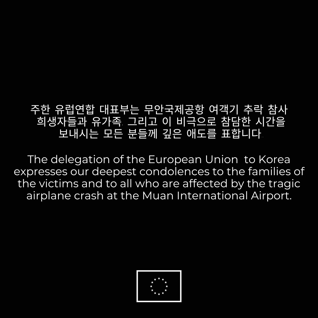 The delegation of the European Union to Korea expresses our deepest condolences to the families of the victims and to all who are affected by the tragic airplane crash at the Muan International Airport.