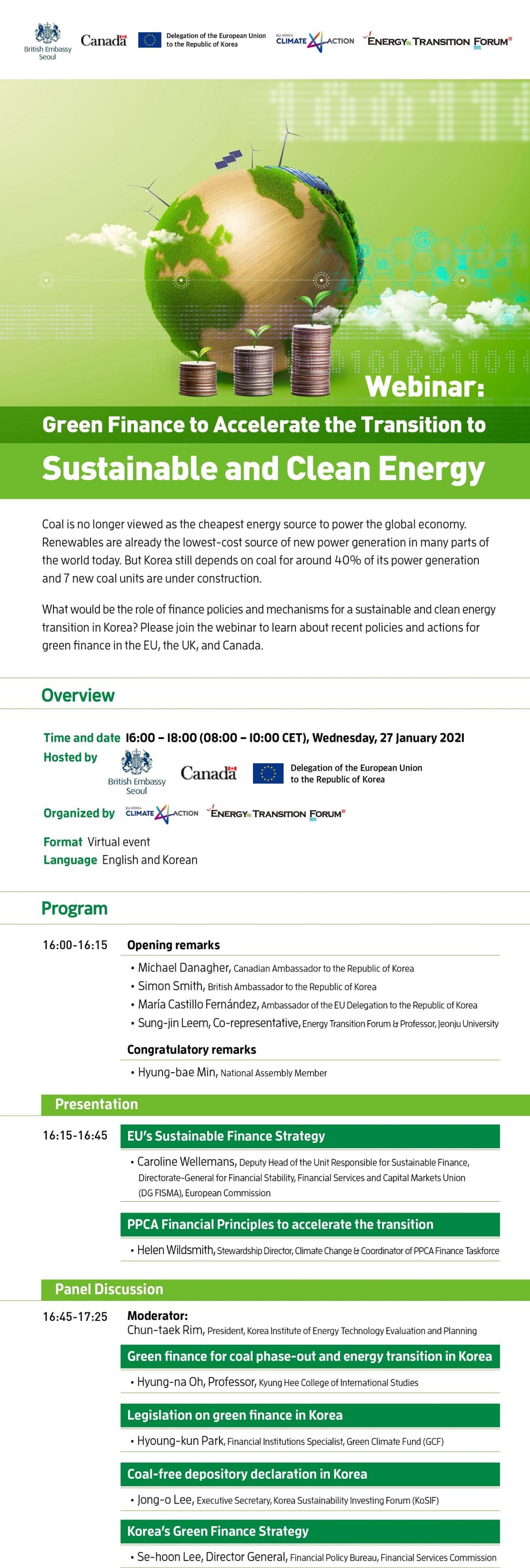 Breadcrumb EEAS South Korea 지속가능한 청정에너지 확대를 위한 녹색금융 웨비나 인쇄하기 지속가능한 청정에너지 확대를 위한 녹색금융 웨비나 18.01.2021 한-EU 기후행동 사업은 주한영국대사관, 주한캐나다대사관, 주한유럽연합대표부 및 에너지전환포럼과 '지속가능한 청정에너지 확대를 위한 녹색금융 웨비나'를 2021년 1월 27일(수) 오후 4시부터 개최합니다. 많은 관심 바랍니다. 더 많은 스토리 STORY 러시아의 우크라이나 전면 침공 4주년: 불안정한 국제정세와 한반도에 미치는 영향 - 패널 토론 STORY 2025 유럽 언어의 날: Languages open hearts & minds! STORY 맥그래스 집행위원 방한, 한·EU 동등성 인정 환영 STORY 2025 유럽연합 그림 공모전 STORY 2025 EU-한 에코디자인 포럼 더 많은 게시물 보기