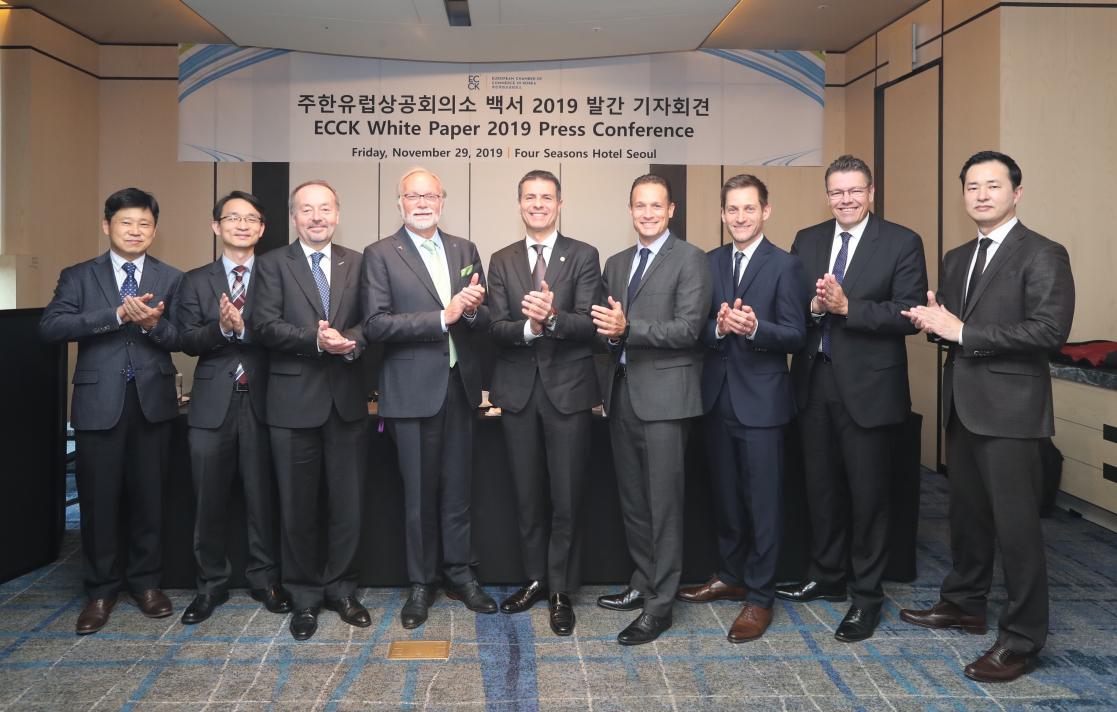 After the press conference, the Ambassador and ECCK held a luncheon meeting with Yoo Myung-hee, Minister for Trade of Ministry of Trade, Industry and Energy (MOTIE). With 50 representatives of ECCK member companies and European embassies in attendance, ECCK officially delivered the ‘ECCK White Paper 2019’ to Minister Yoo.