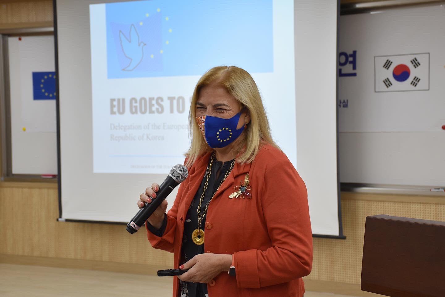 In compliance with the social distancing regulations by the quarantine authorities, under the EU Goes To School programme, Ambassador Maria Castillo Fernandez visted Myeongdeok Girls' High School and delivered a lecture on the EU and EU-RoK relations on 16 November. Ambassador was greeted by the school orchestra, which performed classical music. The high school students asked many questions about the EU, EU-RoK relations, as well as women leadership. This year, limited number of embassies and schools participated in the EU Goes To School using online platforms in accordance with the social distancing guidance.
