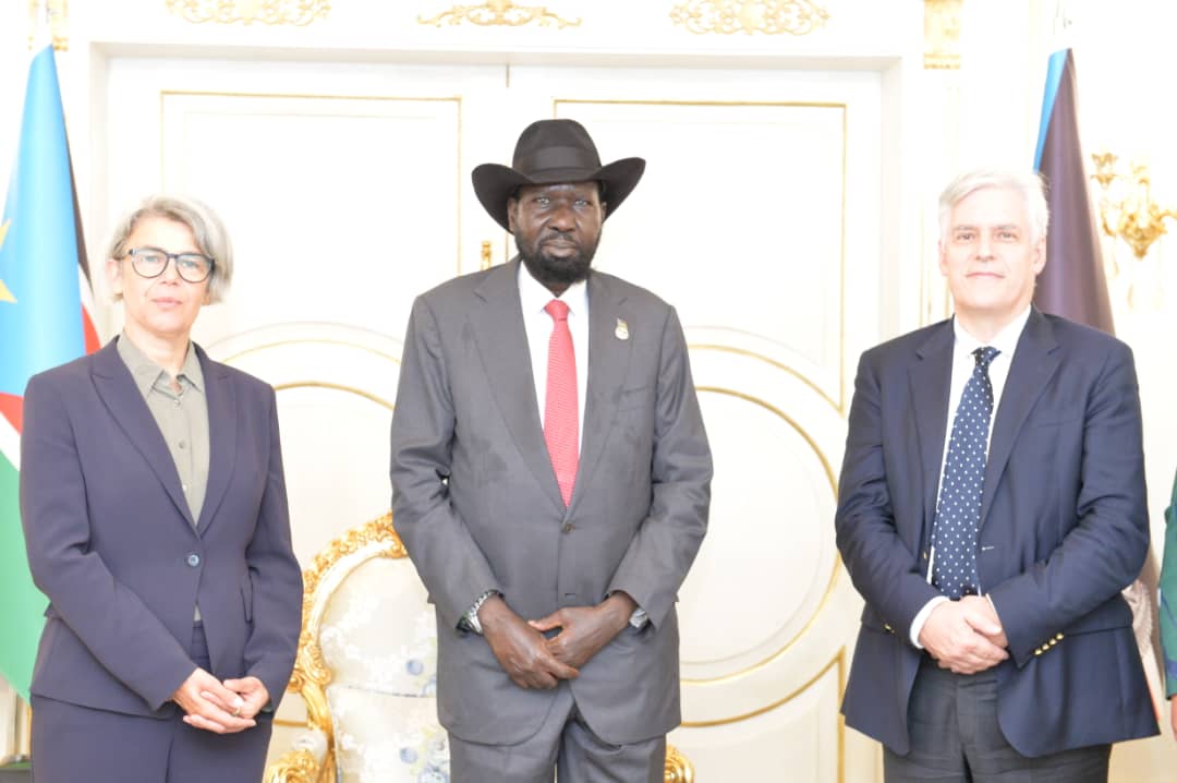 EU HoD Delegation Christian Bader, Dr. Annette Weber, President Salva Kiir, Presidential and Foreign Affairs Ministers Dr. Barnaba Marial and Beatrice Khamisa during the EUSR's visit.
