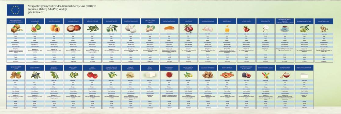 AB’nin Türkiye’den PDO ya da PGI (Korumalı Mahreç Adı) statüsü verdiği ürün isimleri şöyle: Antep baklavası/Gaziantep baklavası, Aydın kestanesi, Aydın İnciri, Bayramiç Beyazı, Malatya kayısısı, Milas zeytinyağı, Taşköprü sarımsağı, Giresun tombul fındığı, Antakya künefesi, Suruç narı, Çağlayancerit cevizi, Gemlik zeytini, Edremit zeytinyağı, Milas yağlı zeytini ve Ayaş domatesi, Edremit Körfezi yeşil çizik zeytini, Maraş tarhanası, Ezine peyniri, Safranbolu safranı, Aydın memecik zeytinyağı, Araban sarımsağı, Bingöl balı, Osmaniye yer fıstığı, Bursa şeftalisi, Hüyük çileği, Bursa siyah inciri/Bursa Siyahı, Söke pamuğu, Manisa mesir macunu, Gaziantep menengiç kahvesi / Gaziantep melengiç kahvesi, Silifke yoğurdu, Aydın memecik zeytini ve Aydın çam fıstığı.