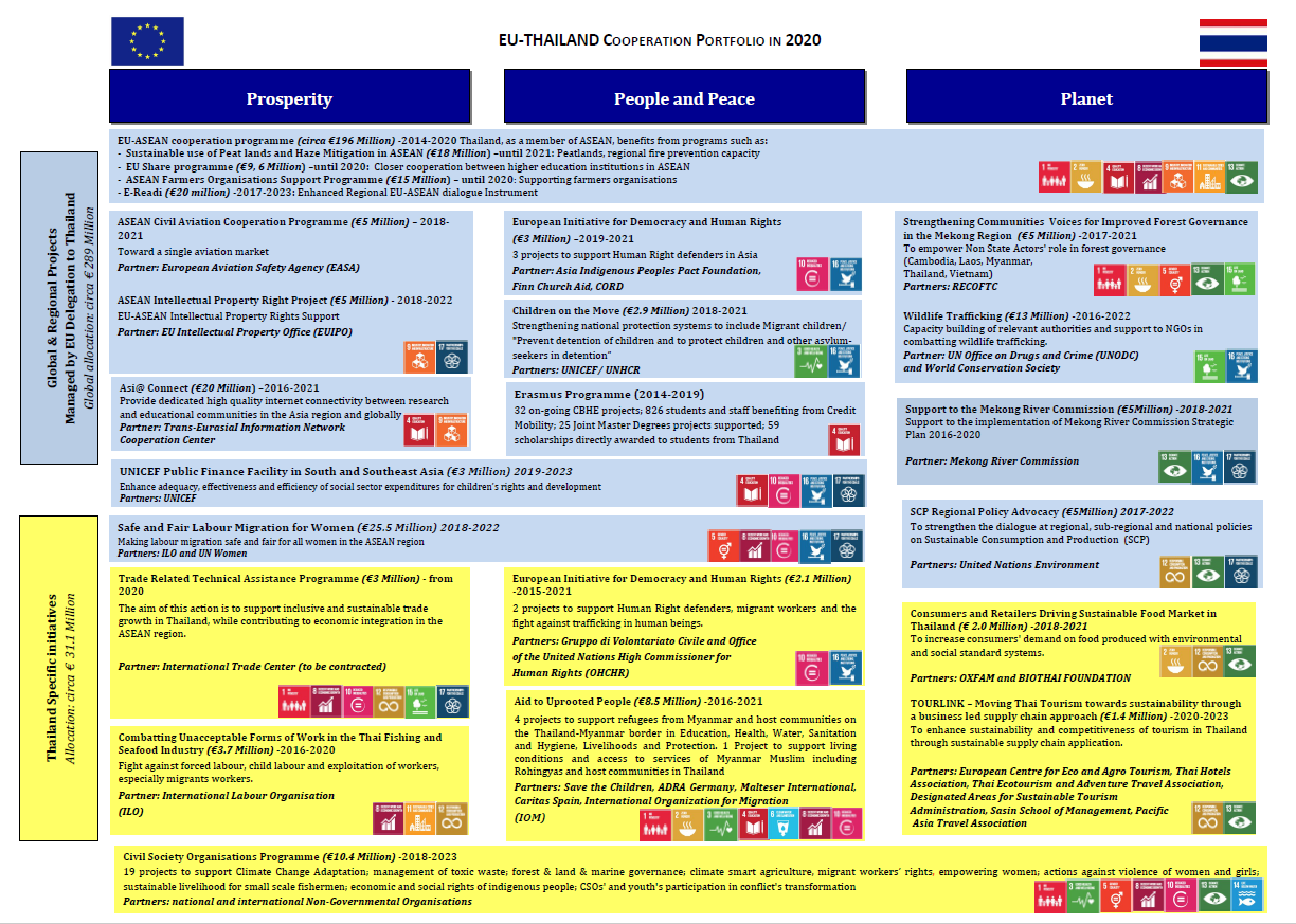 Breadcrumb EEAS Thailand EU-Thailand Cooperation Portfolio In 2020 PRINT EU-Thailand Cooperation Portfolio In 2020 10.07.2020 Above image available as a full-size PDF eu-thai_cooperation_2020.pdf MORE STORIES STORY Born equal, yet striving for equality STORY IP & SMEs in ASEAN: Why intellectual property rights matter for local SMEs STORY Press Release: New local approaches to tackle the plastic waste challenge launched STORY EU Guidelines on Human Rights Defenders (2020) STORY European Union and Member States act in solidarity to bring 7,000 EU citizens stranded in Thailand back home See more