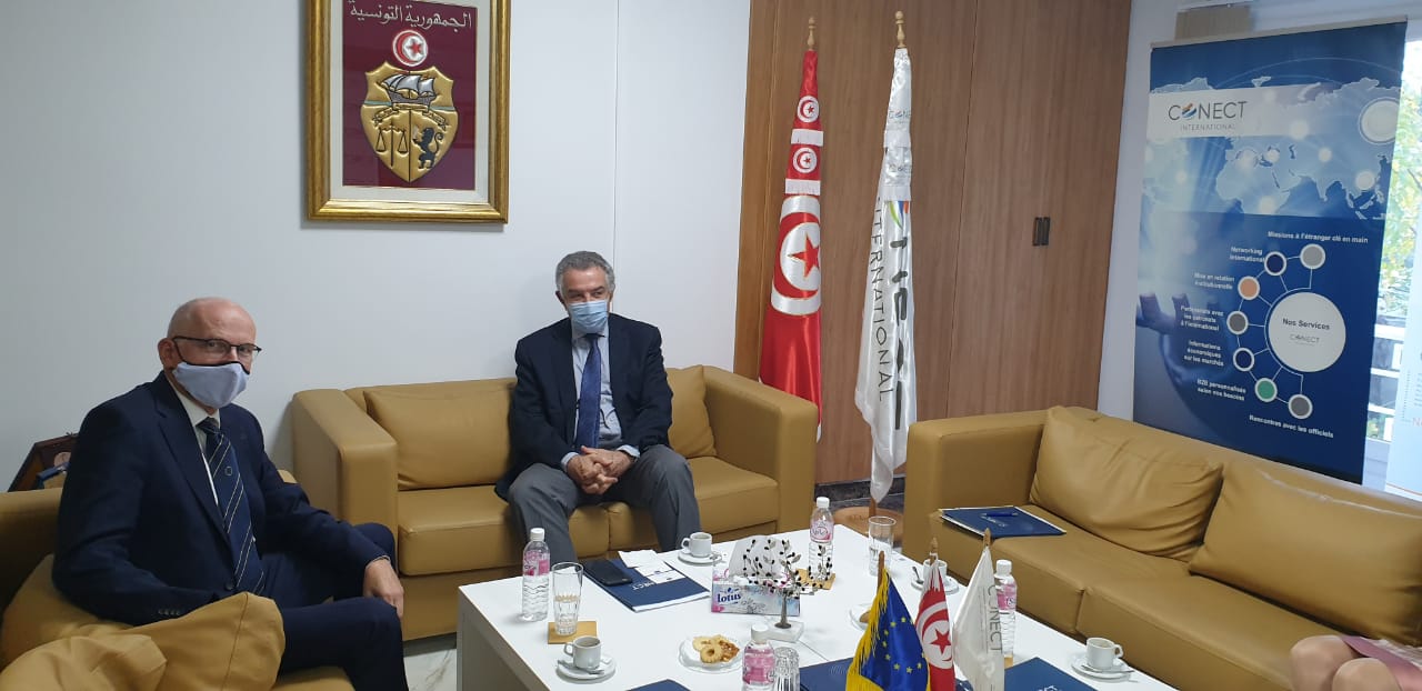 Une réunion s’est tenue, le mardi 17 novembre 2020, au siège de la Confédération des Entreprises Citoyennes de Tunisie (CONECT) entre une représentation de la Délégation de l’Union européenne en Tunisie, présidée par S.E. M. Marcus Cornaro, et M. Tarak Cherif, président de la CONECT, ainsi que Mmes Monia Jeguirim Essaidi et Mongia Amara, membres du bureau exécutif.