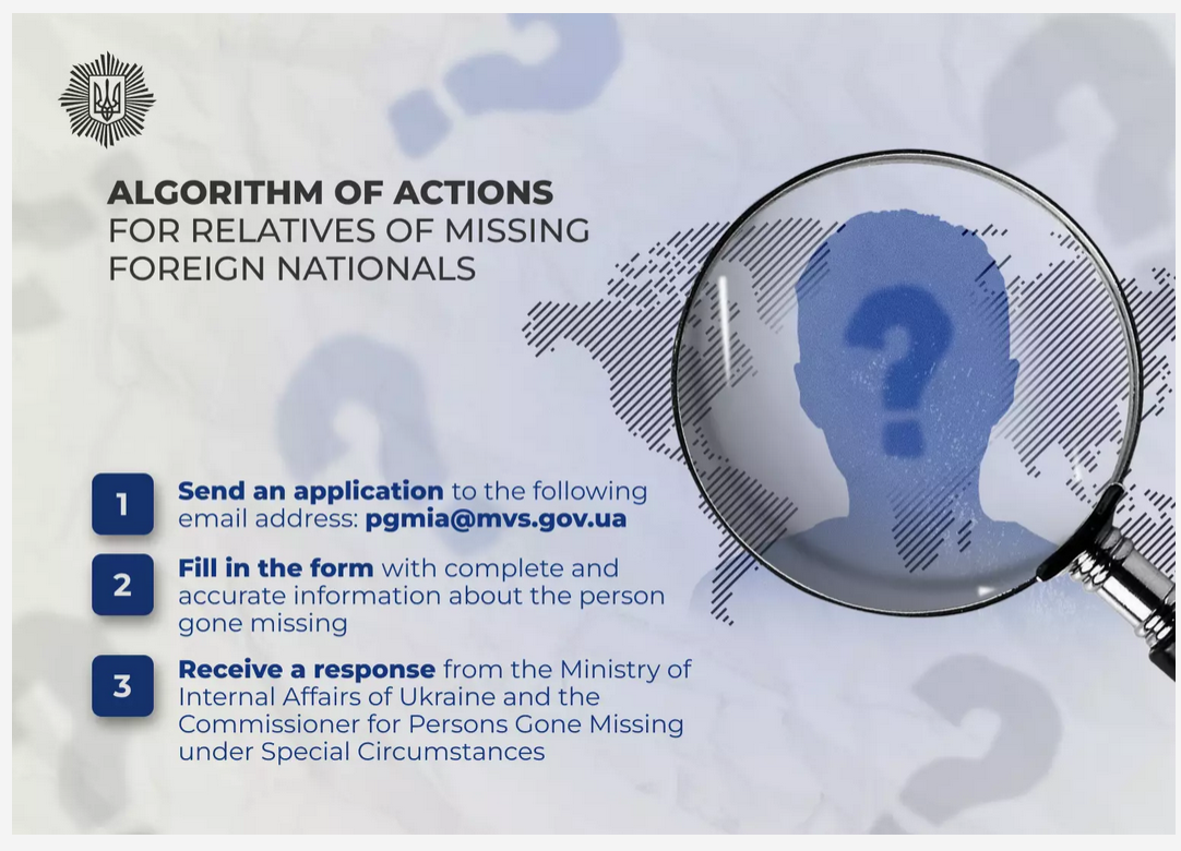 The Ministry of Internal Affairs of Ukraine together with the Commissioner for Persons Gone Missing under Special Circumstances provide relatives of foreign nationals with an algorithm of actions to obtain information and assistance in tracing their close ones.