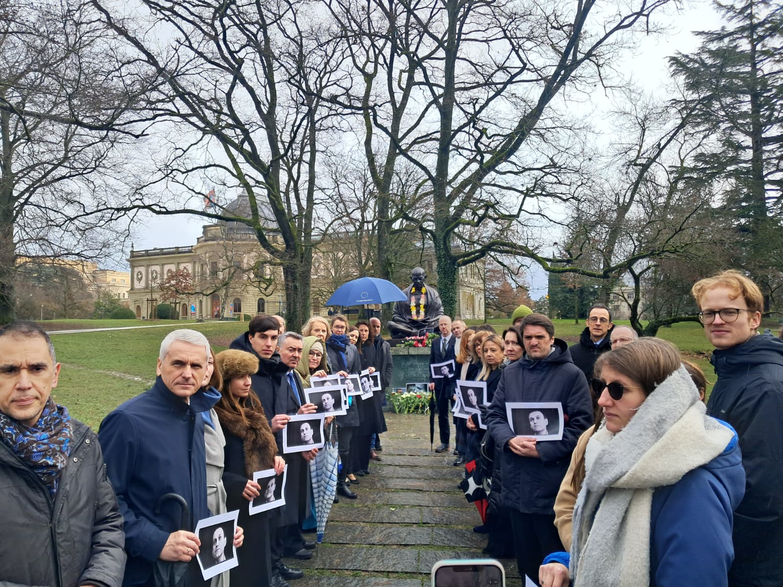 During the ceremony, each participant laid a flower at the Gandhi Statue and held up photographs of Navalny. Following the speech by the EU Ambassador Deike Potzel, attendees observed a minute of silence in remembrance.