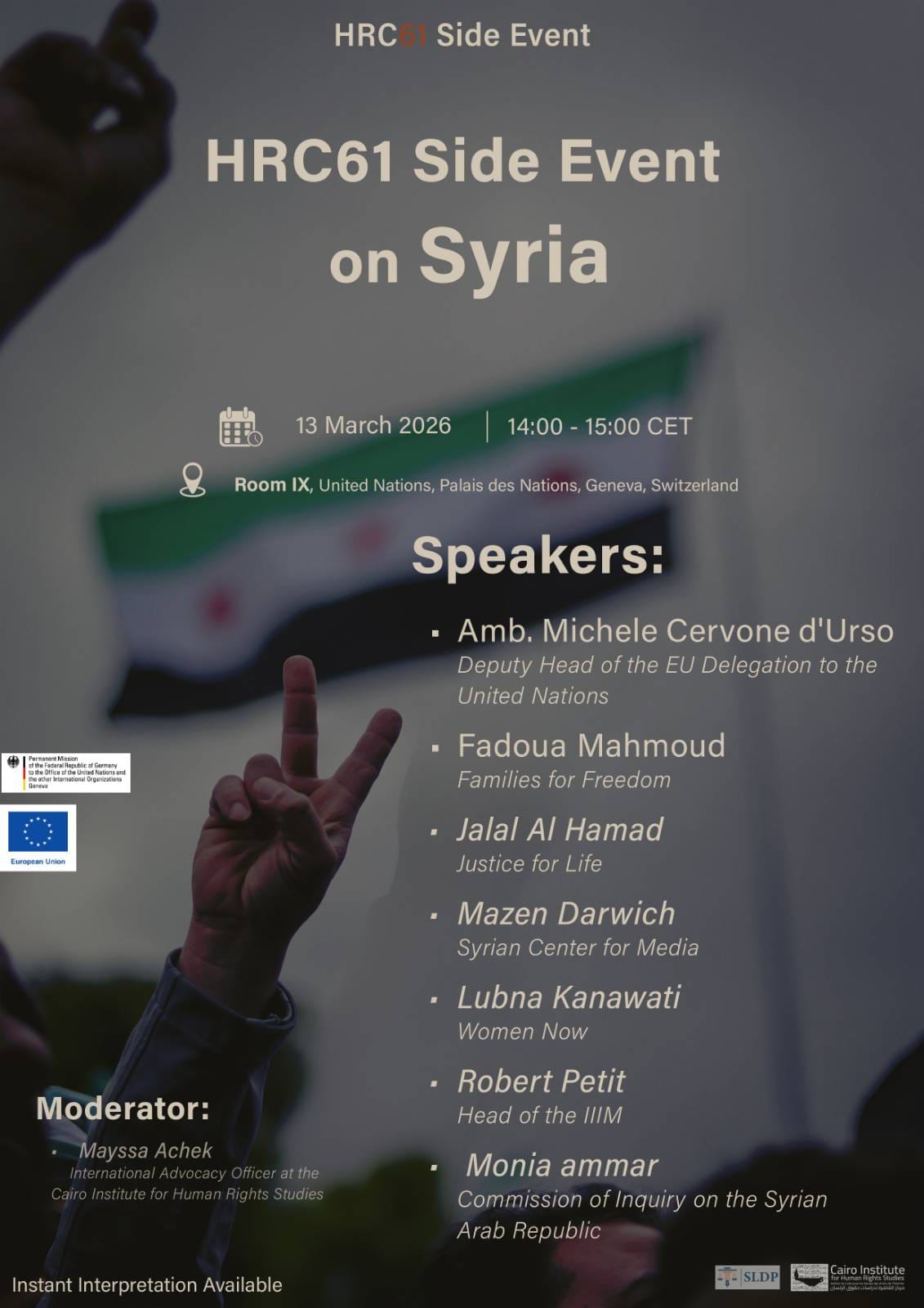 Together with the Permanent Mission of the Federal Republic of Germany to the United Nations in Geneva we invite you to a side event on Syria, taking place on March 13, 2026.