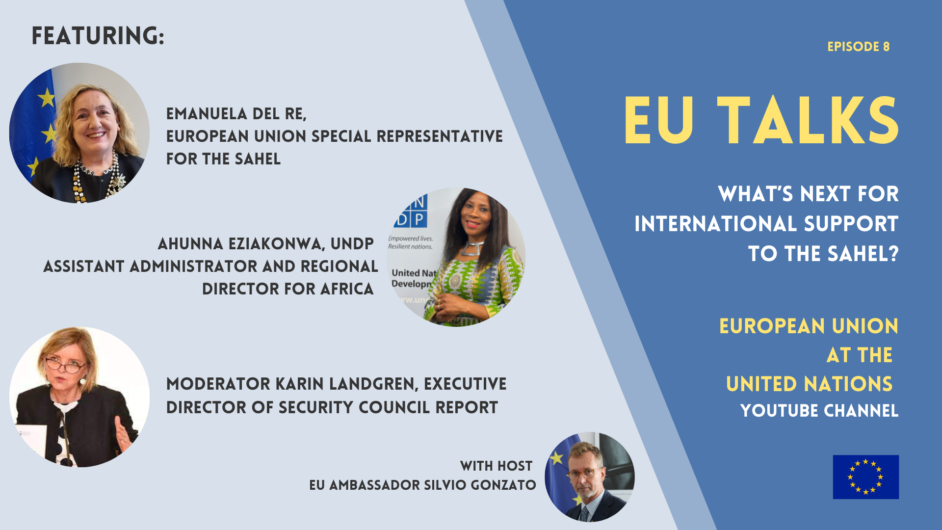 This episode of EU Talks covers a panel discussion with Emanuela Del Re, European Union Special Representative for the Sahel and Ahunna Eziakonwa and UNDP Assistant Administrator and Regional Director for Africa, and moderated by Karin Landgren, Executive Director of Security Council Report. The event excerpts are followed by a short interview with EU Special Representative Emanuela Del Re conducted by EU Ambassador Silvio Gonzato.