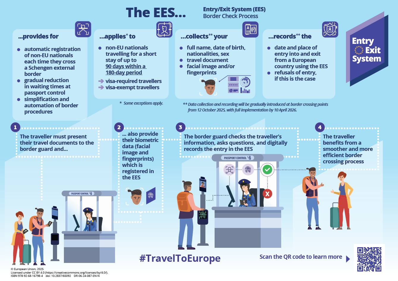 Новая система въезда/выезда (EES) начала функционировать 12 октября 2025 года. Европейские страны, использующие EES, постепенно внедряют эту систему на своих внешних границах. Это означает, что сбор данных на пунктах пересечения границы будет осуществляться постепенно и в полном объеме к 10 апреля 2026 года.