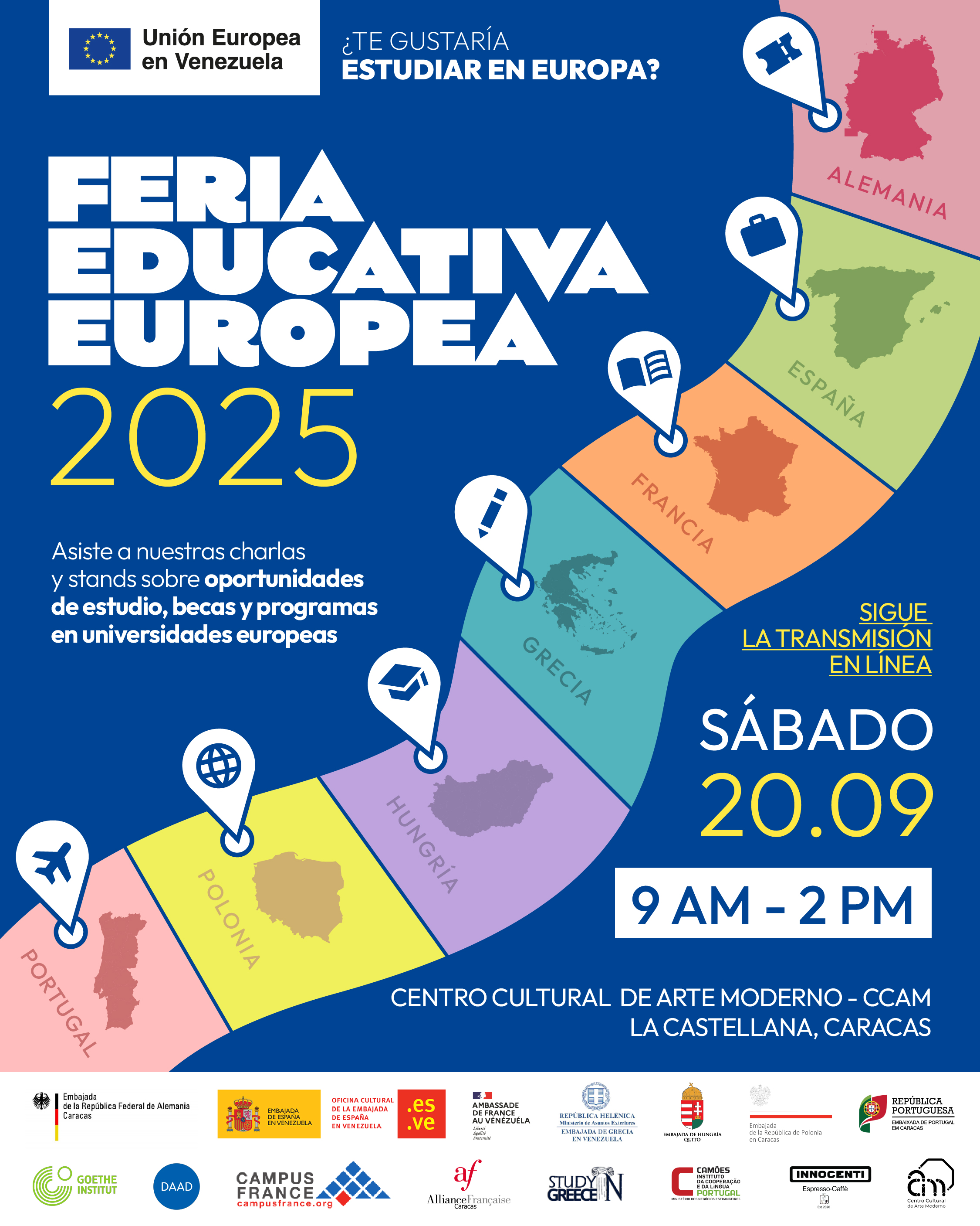 La feria se llevará a cabo de forma presencial en Caracas, en el Centro Cultural de Arte Moderno – CCAM, en La Castellana, y también de forma online en el canal de YouTube de la Unión Europea en Venezuela, entre las 9:00 am y las 2:00 pm.