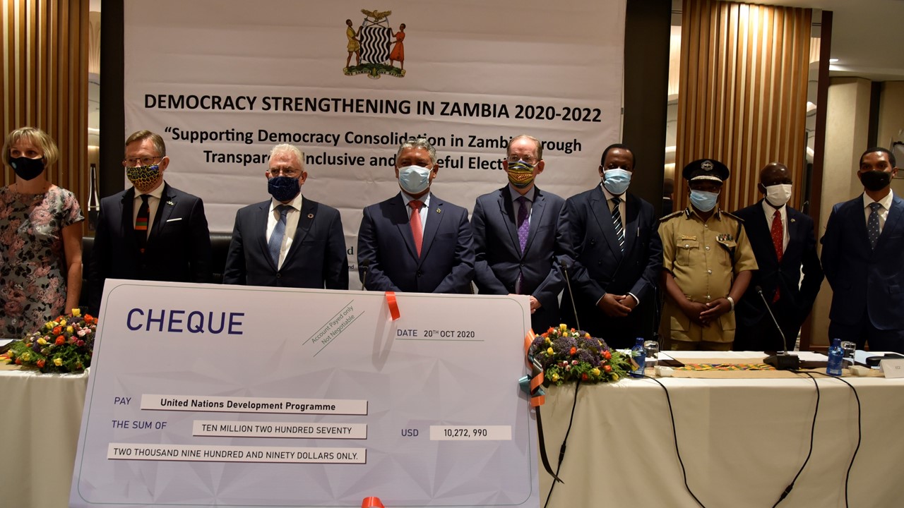 On the 20th of October 2020 the EU Ambassador to Zambia and COMESA, HE Jacek Jankowski, handed over a symbolic check of 6 MEUR to the election basket fund which is being implemented by UNDP in partnership with the Government of Zambia. This brings the contribution of the Team Europe (EU and EU Member States/MS) to a total of 7.8 MEUR. The support involves multiple electoral stakeholders and covers the entire election cycle. It aims to strengthen electoral institutions and processes through long term capacity building of the Electoral Commission, the National Assembly, Ministry of Justice and Ministry of Home Affairs.