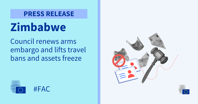 Following its annual review of restrictive measures in relation to Zimbabwe, the EU has lifted all provisions concerning individuals and entities while extending the arms embargo, which restricts the export from the EU to Zimbabwe of equipment that could be used for internal repression. The EU will continue to monitor developments in view of future reviews.