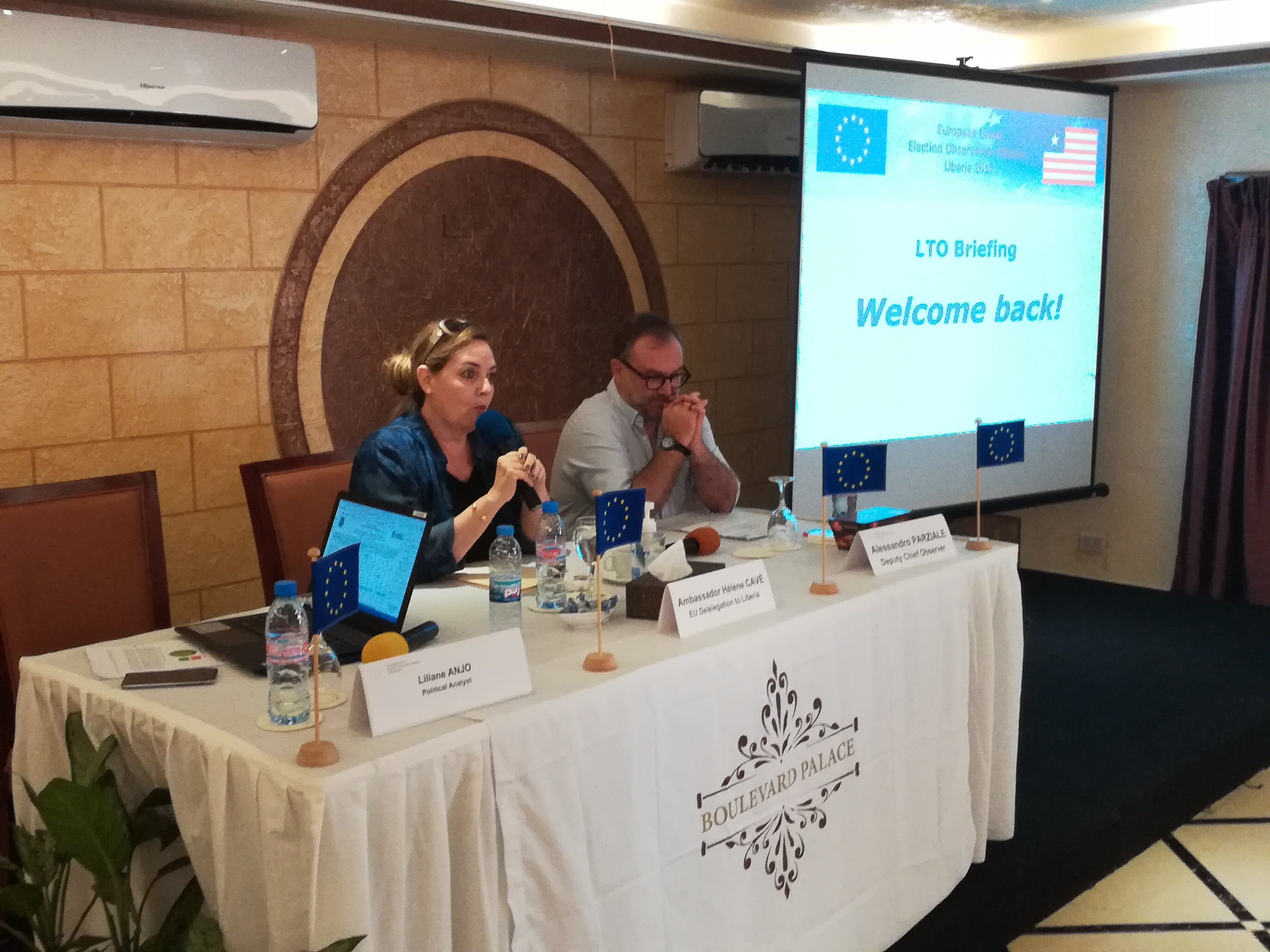 After arriving in Monrovia late on Sunday evening 20 long-term election observers are briefed on latest developments in Liberia on Monday. EU Ambassador Helene Cavé has welcomed the observers in Monrovia. The core-team analysts briefed about the political, legal and electoral developments after the first round of elections. The LTOs will be deployed to all regions in Liberia early Tuesday morning. Later shortly before election day 34 short-term observers will reinforce the EU Election Observation Mission in Liberia.