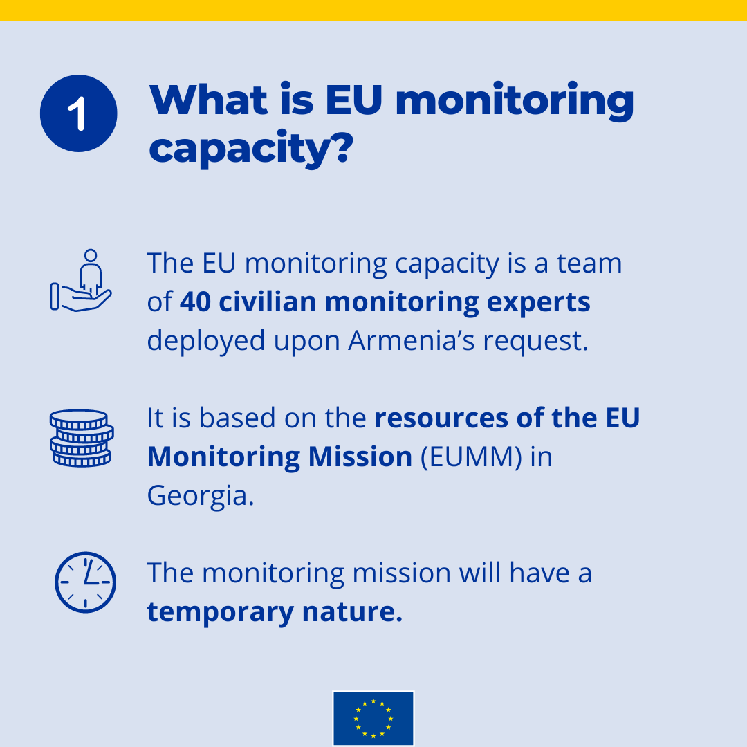 Breadcrumb EEAS EU Monitoring Capacity to Armenia PRINT EU Monitoring Capacity to Armenia 20.10.2022 Strategic Communications The EU Monitoring Capacity in Armenia became operational on 20 October. The action follows the decision by the EU to deploy monitoring experts along the Armenian side of the international border with Azerbaijan. See also Q&A EU Monitoring Capacity to Armenia MORE STORIES STORY Together for Europe's Freedom – Our Training is Living Solidarity STORY Strengthening Inclusive Narratives: EU-LAC Actions at the Santiago International Film Festival (SANFIC) STORY EU Indo-Pacific Ministerial Forums STORY Global Gateway projects STORY Boosting Readiness: FAZSOI Engages in Specialised Programme with Mozambican Defence See more