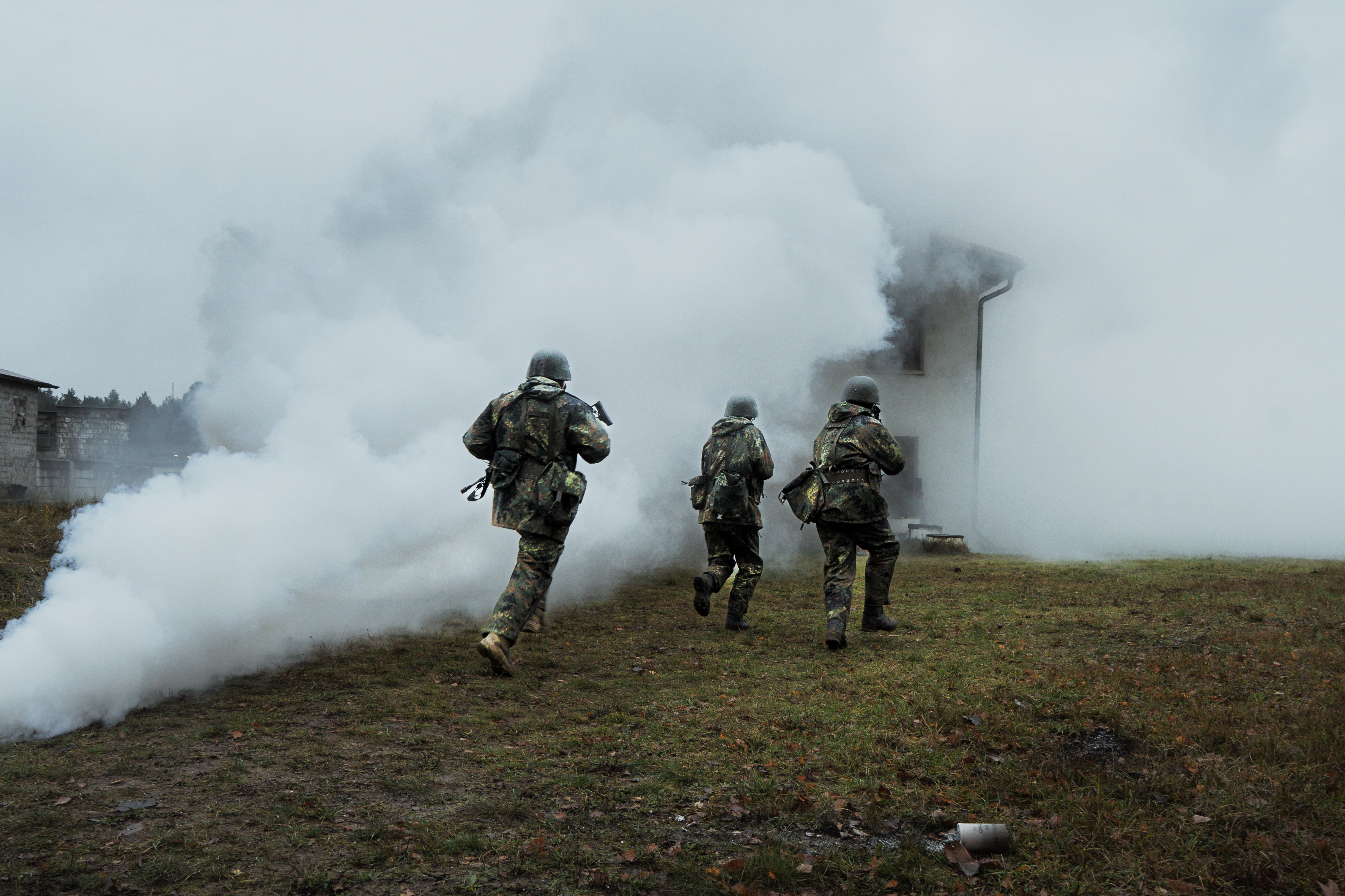 Two smoke grenades, also called smoke pots, are thrown and accurately land between a close-by building and the position of the first squad. The smoke is supposed to obscure the enemy forces’ view of the soldiers’ actions so that these can advance, preferably undetected. The squad leader eventually yells his order and the soldiers launch the assault on the building, protected by the covering fire of the second squad.