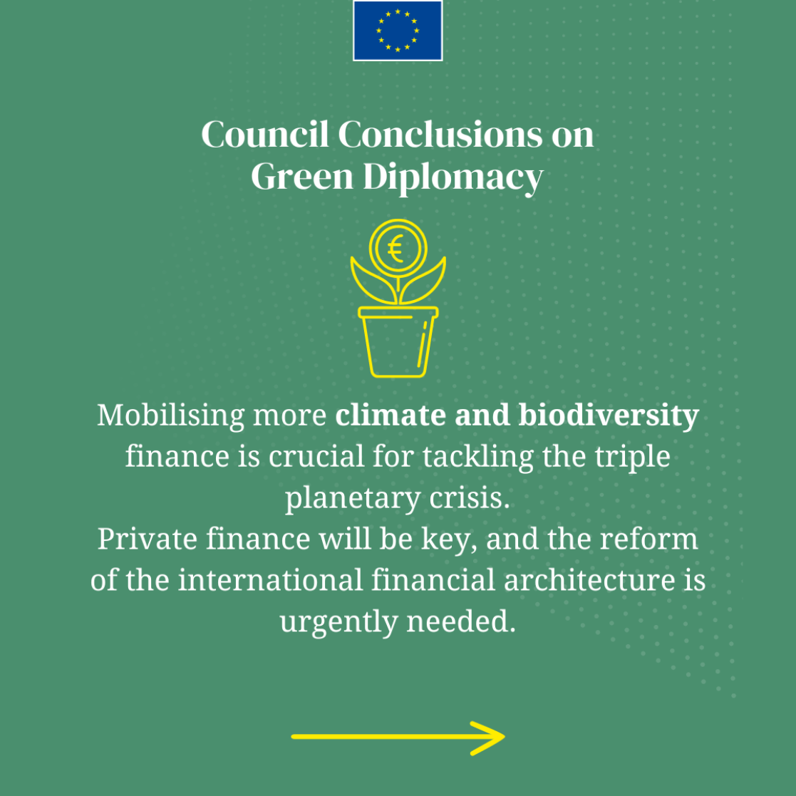 Breadcrumb EEAS Green Diplomacy Council Conclusions PRINT Green Diplomacy Council Conclusions 18.03.2024 EU Green Diplomacy is at the heart of the EU’s foreign and security policy. The EU and its Member States are committed to working closely with partners to help ensure a just and inclusive green transition globally. Learn more. © EU EU EU EU EU EU See also Green diplomacy: Council conclusions reaffirm the EU’s commitment to work closely with partners to accelerate a global… MORE STORIES STORY Ambassadors from the EU’s Political and Security Committee (PSC) and NATO’s North Atlantic Council (NAC) held an informal meeting on military mobility STORY Bucha: Where Accountability Begins STORY EU-Western Balkans Summit: Strengthening Security and Stability Together STORY EU-NGO Human Rights Forum - Partnering for Equality and Non-discrimination STORY Standing guard for Europe See more