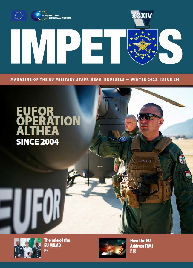 Breadcrumb EEAS Impetus #34 PRINT Impetus #34 14.11.2025 This edition of IMPETUS features articles on EUFOR Operation ALTHEA, the role of the EU MILAD, EUMS and EDA Collaboration and the role of the EUMS Watchkeeping Capability. File EEAS_IMPETUS_34_Dec2025_digi-1 FINAL.pdf