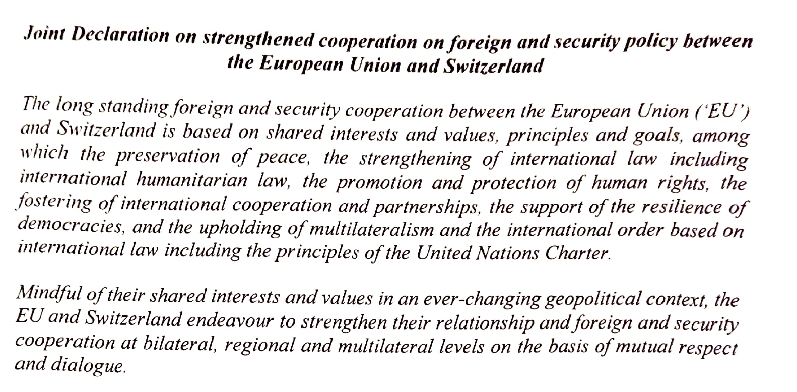 Breadcrumb EEAS Joint Declaration on strengthened cooperation on Foreign and Security Policy between the European Union and Switzerland PRINT Joint Declaration on strengthened cooperation on Foreign and Security Policy between the European Union and Switzerland 05.03.2026 File Adobe Scan 05 mar 2026.pdf