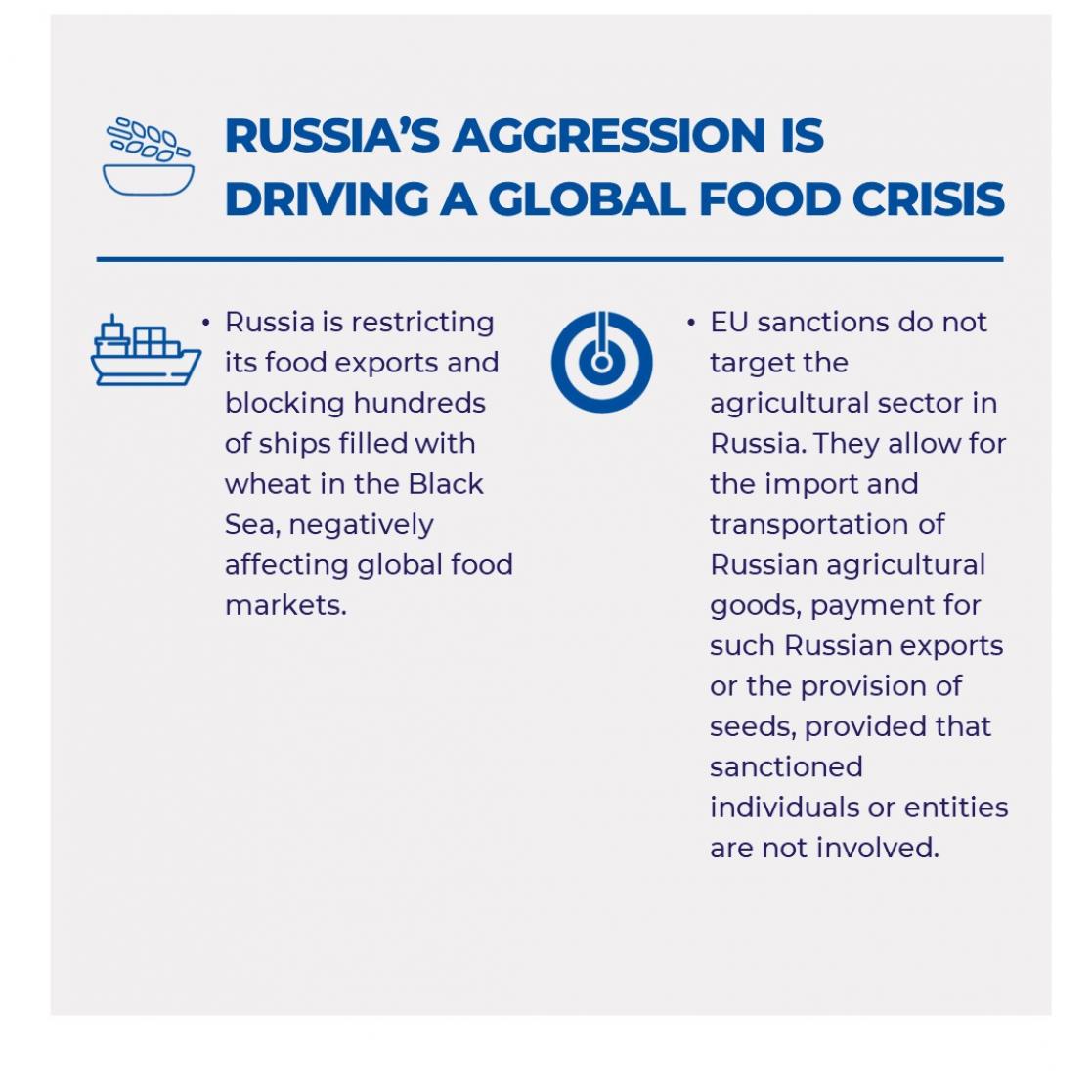 Breadcrumb EEAS Russia's aggression is driving a global food crisis PRINT Russia's aggression is driving a global food crisis 25.05.2022 Strategic Communications Russia’s illegal invasion of Ukraine has created a global food crisis, disrupting food supply chains and provoking hunger around the world. This will have far-reaching consequences for developing countries. MORE STORIES STORY Ambassadors from the EU’s Political and Security Committee (PSC) and NATO’s North Atlantic Council (NAC) held an informal meeting on military mobility STORY Bucha: Where Accountability Begins STORY EU-Western Balkans Summit: Strengthening Security and Stability Together STORY EU-NGO Human Rights Forum - Partnering for Equality and Non-discrimination STORY Standing guard for Europe See more