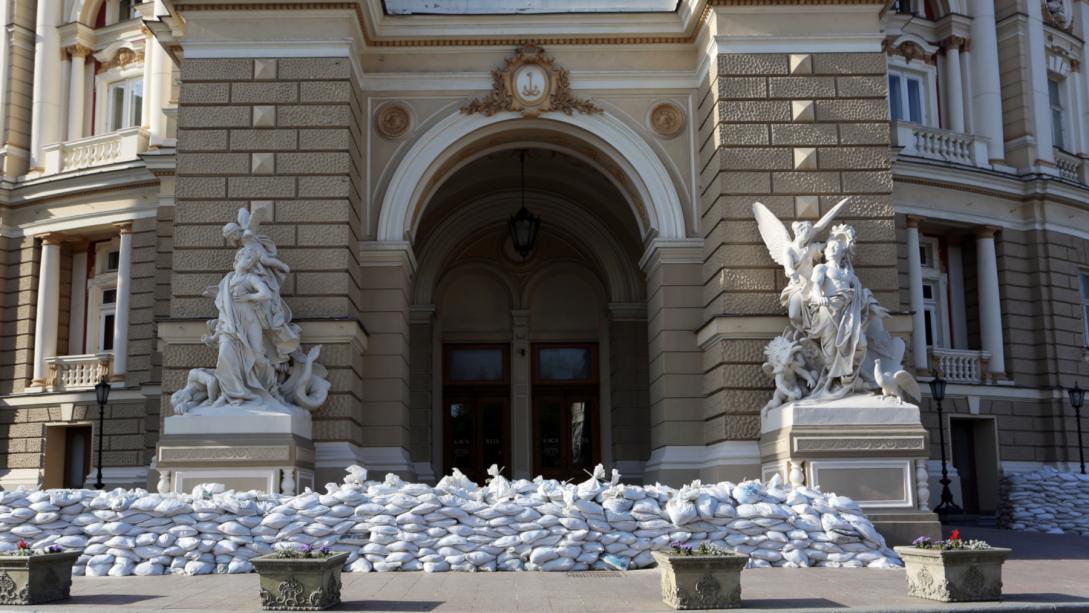 Pictured: Odessa, Ukraine June,1,2022 Odessa State Academic Opera and Ballet Theatre. Barricades and sandbags.