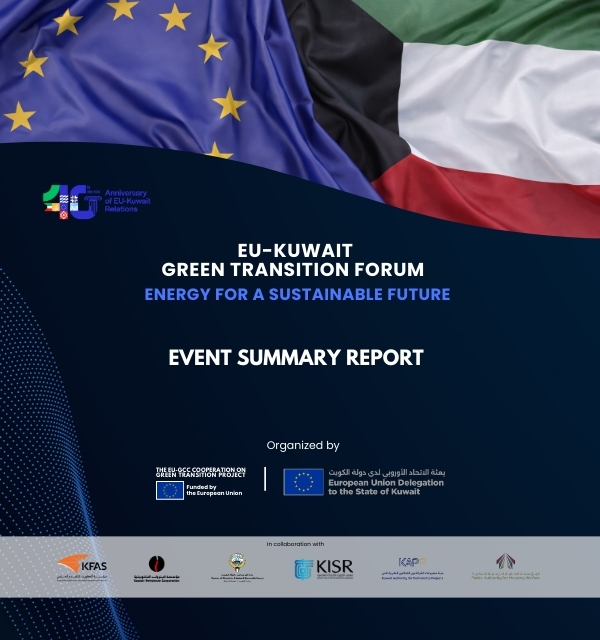 Held on 8 February 2026 in Kuwait City, the EU–Kuwait Green Transition Forum, organised in cooperation with the Ministry of Electricity, Water and Renewable Energy (MEWRE) and the Kuwait Institute for Scientific Research (KISR), convened senior policymakers, industry leaders, financial institutions, researchers, and civil society representatives to advance EU–Kuwait collaboration on clean energy, climate resilience, sustainable finance, and green skills development. The Forum reinforced strategic dialogue under the EU–GCC Cooperation on Green Transition and identified practical pathways to accelerate a just and inclusive green transition.