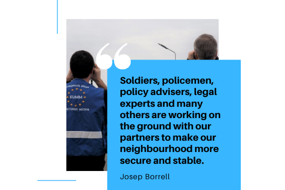Soldiers, policemen, policy advisers, legal experts and many others are working on the ground with our partners to make our neighbourhood more secure and stable. They train, they advise, they mentor and they monitor. Their work is not just technical, but part of a comprehensive approach, or the European way of building security. They are always based on a UN mandate and faithful to EU’s values of peace, stability, multilateralism and human rights.